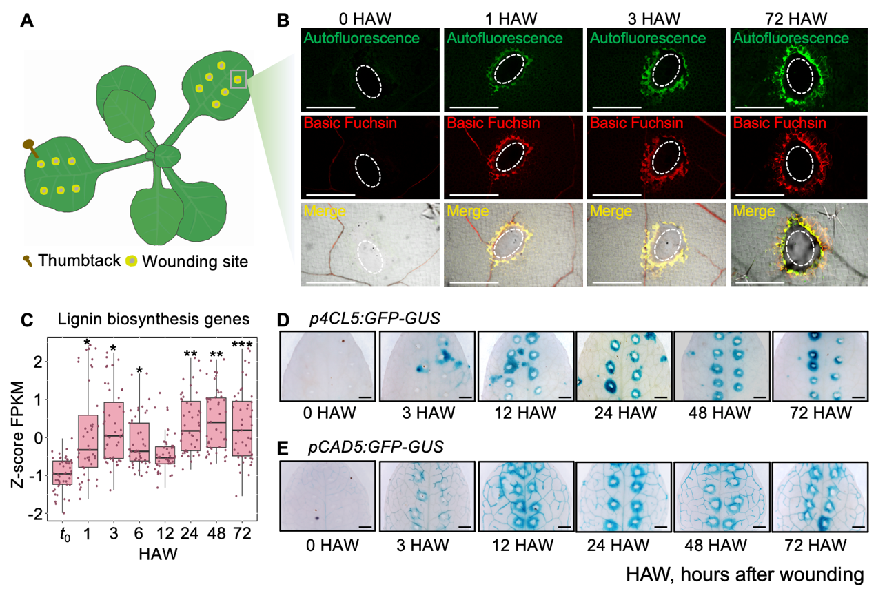 JA伤口响应是瞬时的,当JA信号通路被阻断时,RAP2.6的持续响应显著减弱,进一步证实了JA信号对RAP2.6表达的持久影响。更进一步发现, 脱落酸(ABA)持续响应伤口,当阻断ABA合成时,RAP2.6的伤口响应受到抑制,且木质素沉积相应减少(图2)。