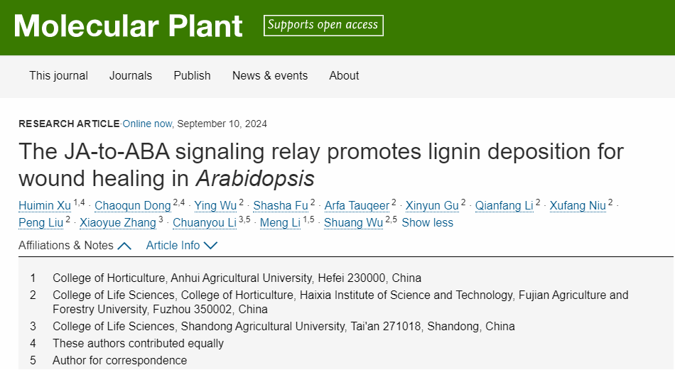 本网讯 植物在生长中常遇到虫害取食造成伤口,但植物伤口愈合机制尚未完全清楚。近日,安徽农业大学园艺学院蔬菜器官发育与逆境适应团队在国际顶尖植物学期刊Molecular Plant上在线发表题为“The JA-to-ABA signaling relay promotes lignin deposition for wound healing in Arabidopsis”的研究论文,揭示了茉莉酸(JA)信号通过MYCs-RAP2.6模块在植物伤口愈合过程中调控木质素持续累积的关键作用。