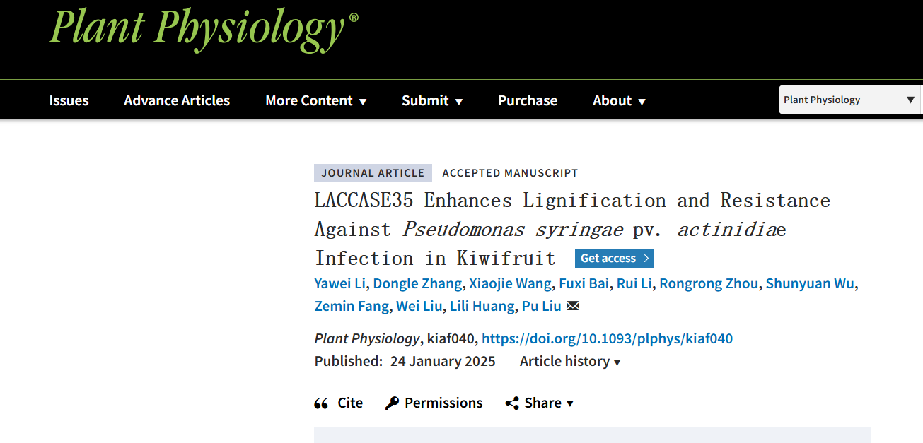 近日,安徽农业大学园艺学院果树抗病机制与种质创新团队在Plant Physiology在线发表了题为“LACCASE35 Enhances Lignification and Resistance Against Pseudomonas syringae pv. actinidiae Infection in Kiwifruit”的研究论文,揭示了漆酶基因AcLac35诱导猕猴桃细胞壁木质化增强了对溃疡病菌抗性的新发现。