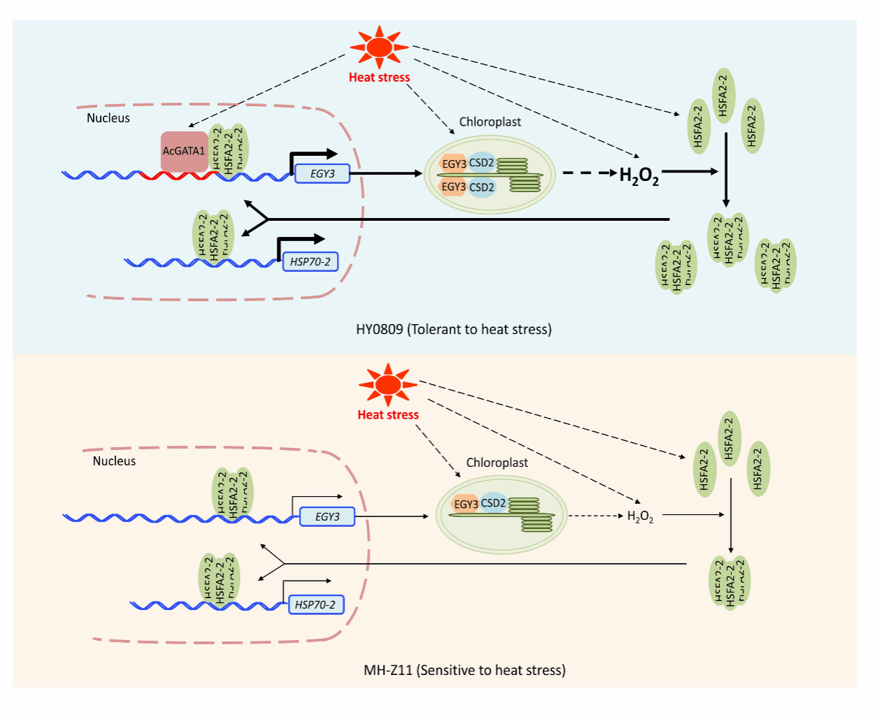 本课题组前期对拟南芥的同源基因EGY3的研究发现,该基因编码的蛋白定位叶绿体,可以通过调节叶绿体ROS的稳态来调控拟南芥对盐胁迫的抗性,论文发表于《Cell Reports》(相关介绍请参阅https://mp.weixin.qq.com/s/jY_8kYaw1ZorMyk0qXwvKg)。本研究进一步确认了AcEGY3在猕猴桃中也具有类似的功能,可以与猕猴桃AcCSD2蛋白互作,增强高温胁迫下叶绿体H2O2的产生。叶绿体产生的H2O2可以释放到细胞质中诱导AcHSFA2-2形成多聚体,增强其转录活性,诱导下游HSF70-2和HSF20等基因的高表达,从而提高猕猴桃的耐热性。
