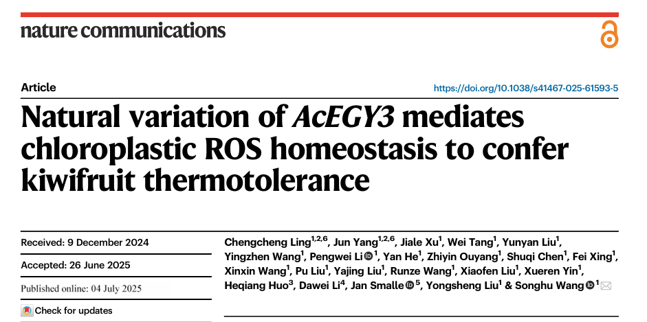 本网讯 7月5日,安徽农业大学园艺学院汪松虎课题组在《Nature Communications》上发表了题为“Natural variation of AcEGY3 mediates chloroplastic ROS homeostasis to confer kiwifruit thermotolerance”的研究论文。该研究发掘了首个调控猕猴桃耐热性的自然变异,为提高猕猴桃耐热性的遗传改良提供重要的基因资源。