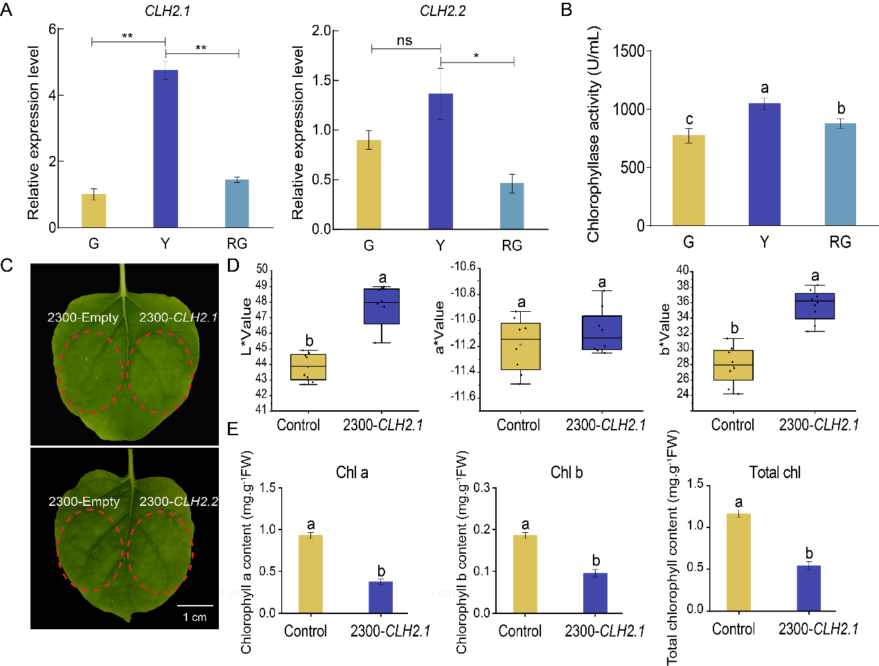 结合DNA甲基化组与转录组,发现了叶绿素代谢途径中基因的启动子CHH甲基化与其差异表达相关,BrCLH2.1在低温黄化期表达上调4.8倍,其启动子区CHH甲基化水平显著下降,BrCLH2.1表达水平与启动子甲基化水平呈负相关,并且BrCLH2.1的表达水平与叶绿素含量的变化趋势一致。本氏烟草瞬时表达系统验证:仅BrCLH2.1可诱导叶片褪绿,Chl a、b含量分别下降42%与38%。