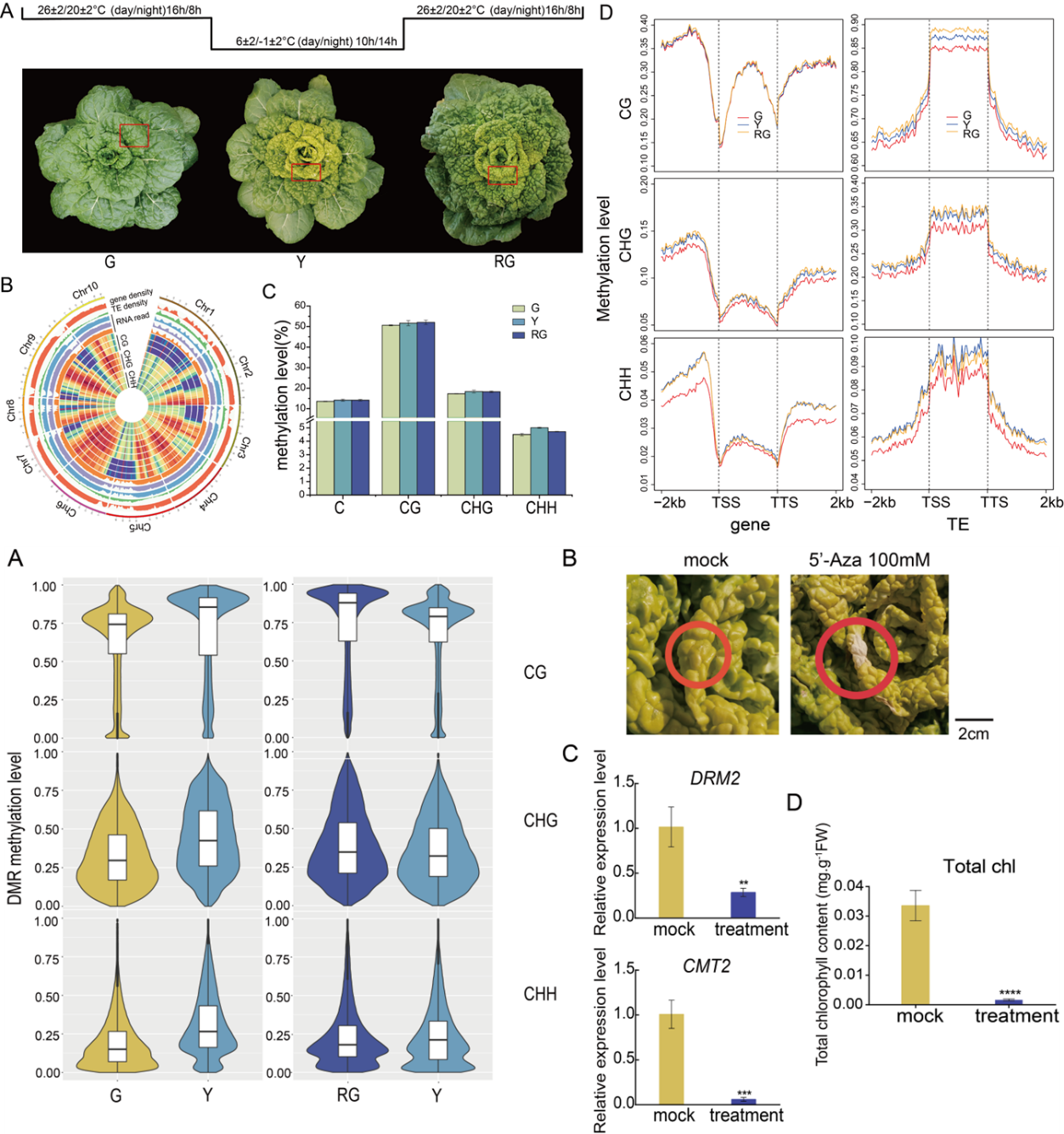 DNA甲基化是一种重要的表观遗传修饰,在植物生长和发育过程中发挥着重要的作用,包括器官发育、种子萌发、果实成熟、开花和叶片衰老。该研究发现,乌菜内叶黄化的不同发育阶段中CHH背景下DNA甲基化水平发生了动态化变化,在低温条件下,CHH甲基化水平升高,而在正常温度下,CHH的甲基化水平略有下降。在叶片由黄转绿的过程中,大多数高差异甲基化区域(DMR)和低DMR分布在的CHH背景的启动子区,表明启动子区域的CHH甲基化在乌菜内叶黄化中起着关键作用。DNA甲基化抑制剂5’-Aza在乌菜内叶中的应用诱导了叶片明显的漂白,总叶绿素含量显著降低,进一步支持DNA低甲基化在乌菜内叶黄化中的作用。