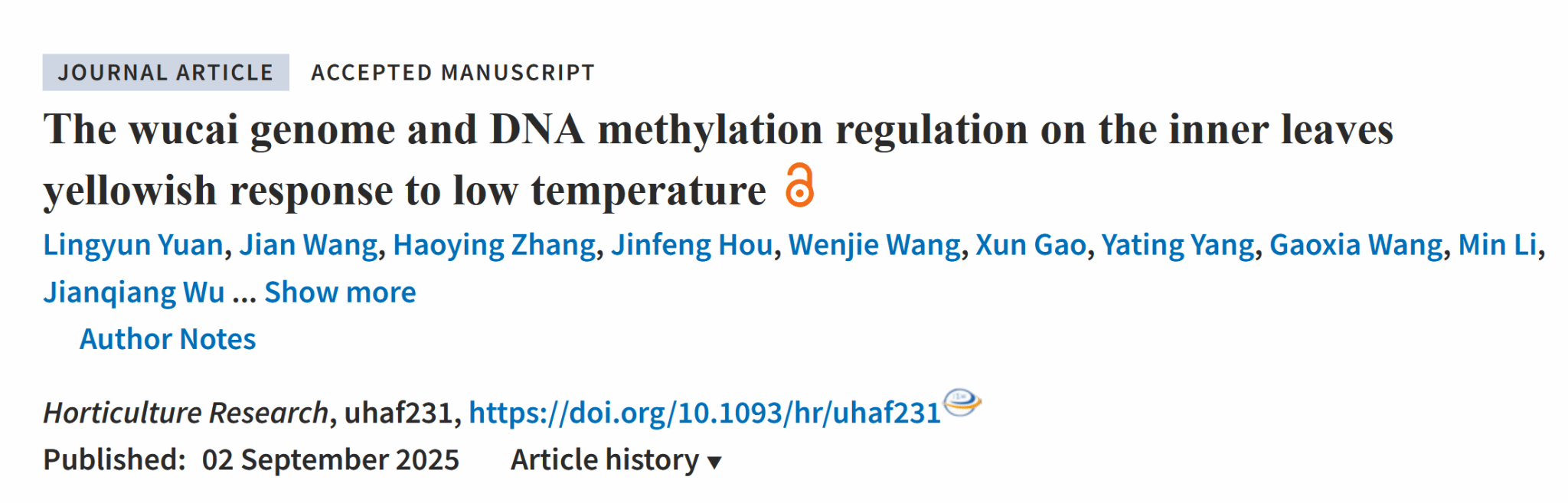我校园艺学院汪承刚/袁凌云教授课题组在《Horticulture Research》(中科院1区,Top期刊)上发表了题为《The wucai genome and DNA methylation regulation on the inner leaves yellowish response to low temperature》的研究论文,该研究首次构建了染色体级别的乌菜高质量参考基因组(480.57Mb),并整合转录组和全基因组甲基化亚硫酸盐测序数据,探究低温诱导乌菜内叶黄化的表观遗传调控机制,为不结球白菜的功能基因组学研究和遗传育种提供了理论支撑。