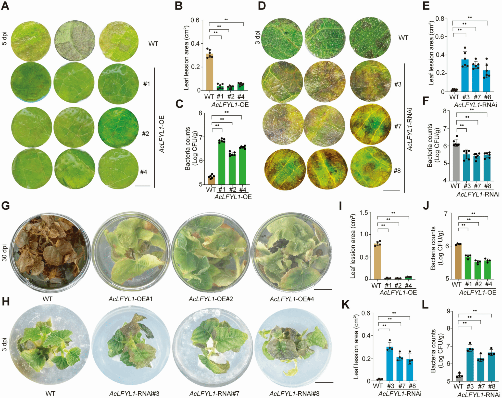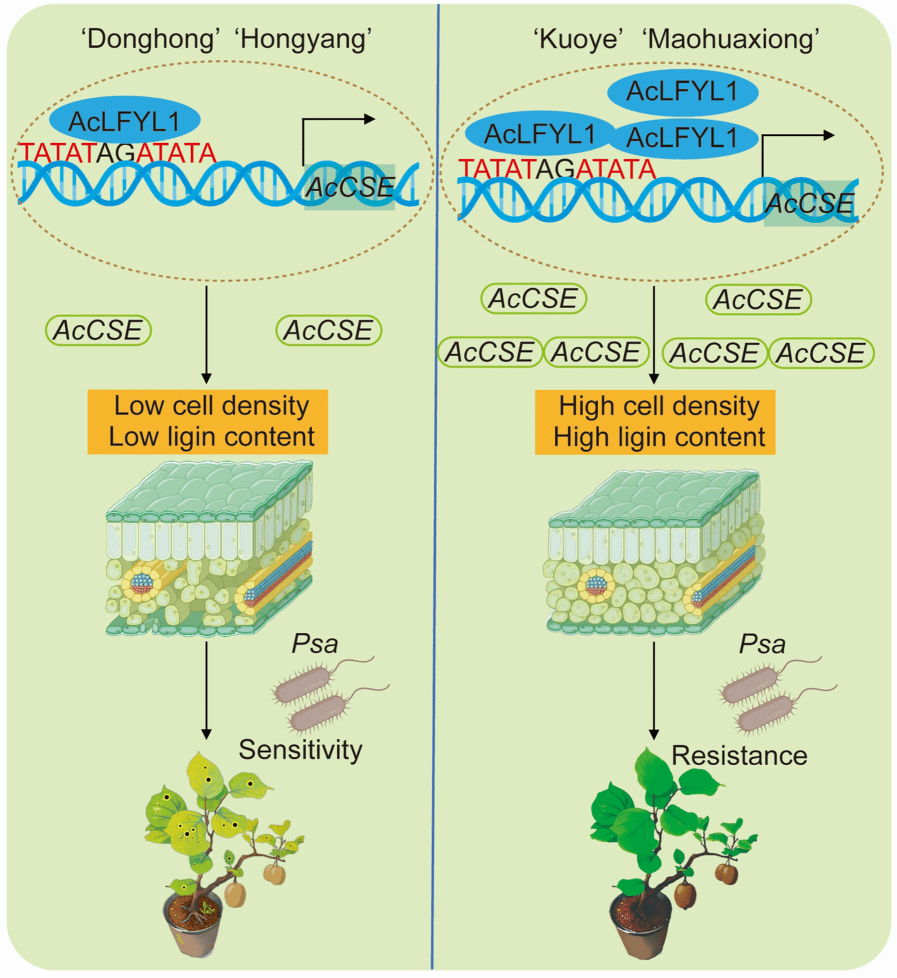 本网讯 3月24日,园艺学院果树基因组学与分子育种团队在《Journal of Integrative Plant Biology》在线发表了题为“The AcLFYL1-AcCSE Module Enhances Kiwifruit Resistance to Pseudomonas syringae pv. actinidiae by regulating cell density and lignin biosynthesis”的研究论文。该团队在高抗溃疡病的种质资源“MHX”和“KY”中成功鉴定到一个关键转录因子AcLFYL1,过表达AcLFYL1显著提高叶片细胞密度、细胞壁厚度和木质素含量,增强Psa抗性(图1);RNAi沉默则相反。进一步机制研究表明,AcLFYL1可直接结合并激活木质素合成关键基因AcCSE。过表达AcCSE同样增强抗病性,而干扰AcCSE则削弱由AcLFYL1介导的抗病效果。该研究揭示了AcLFYL1-AcCSE分子模块通过协同调控细胞密度与木质素生物合成,增强猕猴桃对溃疡病抗性的新机制。