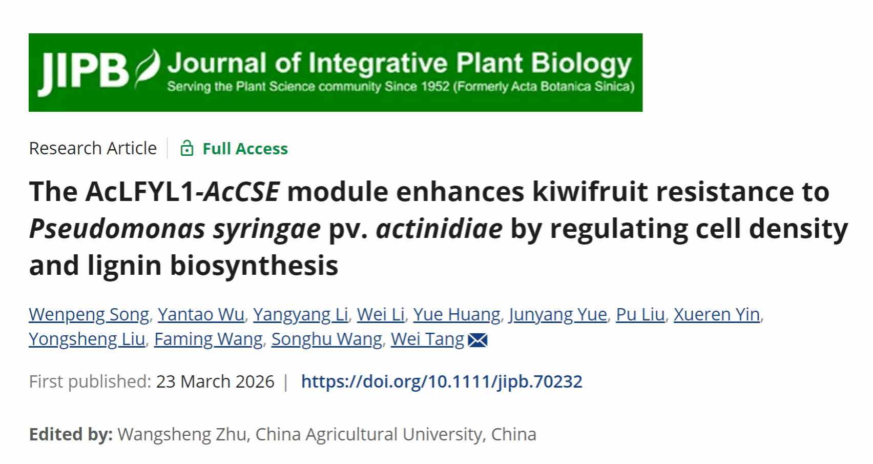 AcLFYL1属于LEAFY(LFY)转录因子家族,该家族主要与植物花期调控和花器官的发育相关。但本研究发现AcLFYL1正向调控Psa抗性。这一发现不仅拓展了人们对LFY转录因子家族功能的认识,也为猕猴桃溃疡病抗病育种提供了重要的理论依据和基因资源。论文链接:https://onlinelibrary.wiley.com/doi/10.1111/jipb.70232