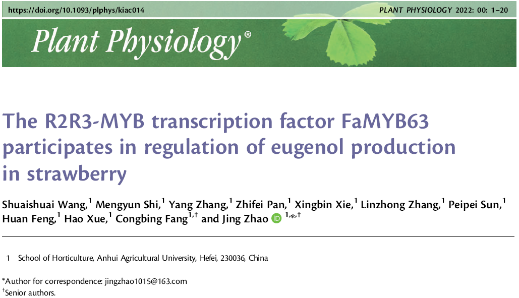 近日,我院草莓研究团队在国际植物科学领域重要期刊《Plant Physiology》(IF=8.340)发表了题为“The R2R3-MYB transcription factor FaMYB63 participates in regulation of eugenol production in strawberry”的研究论文,揭示了FaMYB63调控草莓果实丁香酚代谢的分子机制。