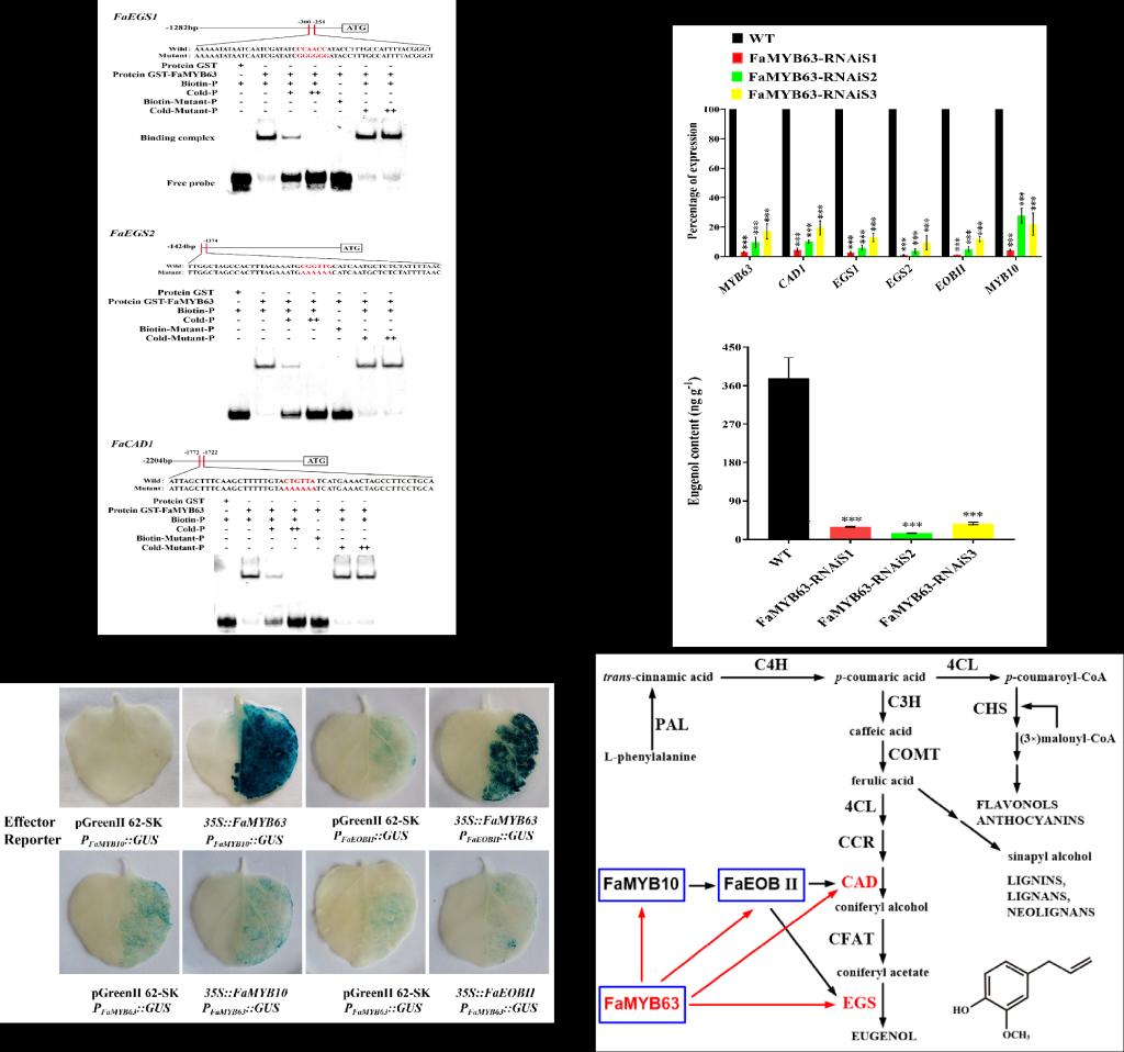 在草莓中,丁香酚合酶编码基因FaEGS1和FaEGS2以及肉桂醇脱氢酶编码基因FaCAD1对于丁香酚的产生至关重要。FaEGS1和FaEGS2主要分别在草莓绿果期和成熟期果实中表达。本研究为鉴定参与调控FaEGS1的转录因子,利用FaEGS1启动子为诱饵进行酵母单杂筛选,并对其筛选结果中一个R2R3-MYB转录因子FaMYB63进行进一步研究。FaMYB63定位于细胞核,RT-qPCR分析表明,FaMYB63表达具有组织和阶段特异性,并与草莓果实发育期间的丁香酚含量相一致,且被脱落酸(ABA)抑制和生长素(IAA)激活。FaMYB63过表达和RNAi介导的沉默导致丁香酚合成基因FaEGS1、FaEGS2和FaCAD1的转录水平发生显著变化,进而影响丁香酚积累。EMSA、酵母单杂、GUS活性和双荧光素酶活性检测结果表明,FaEOBII和FaMYB10的转录同样受FaMYB63调控,但反之则不然。总之,这些结果为深入了解草莓丁香酚合成途径的调控网络提供了新思路。