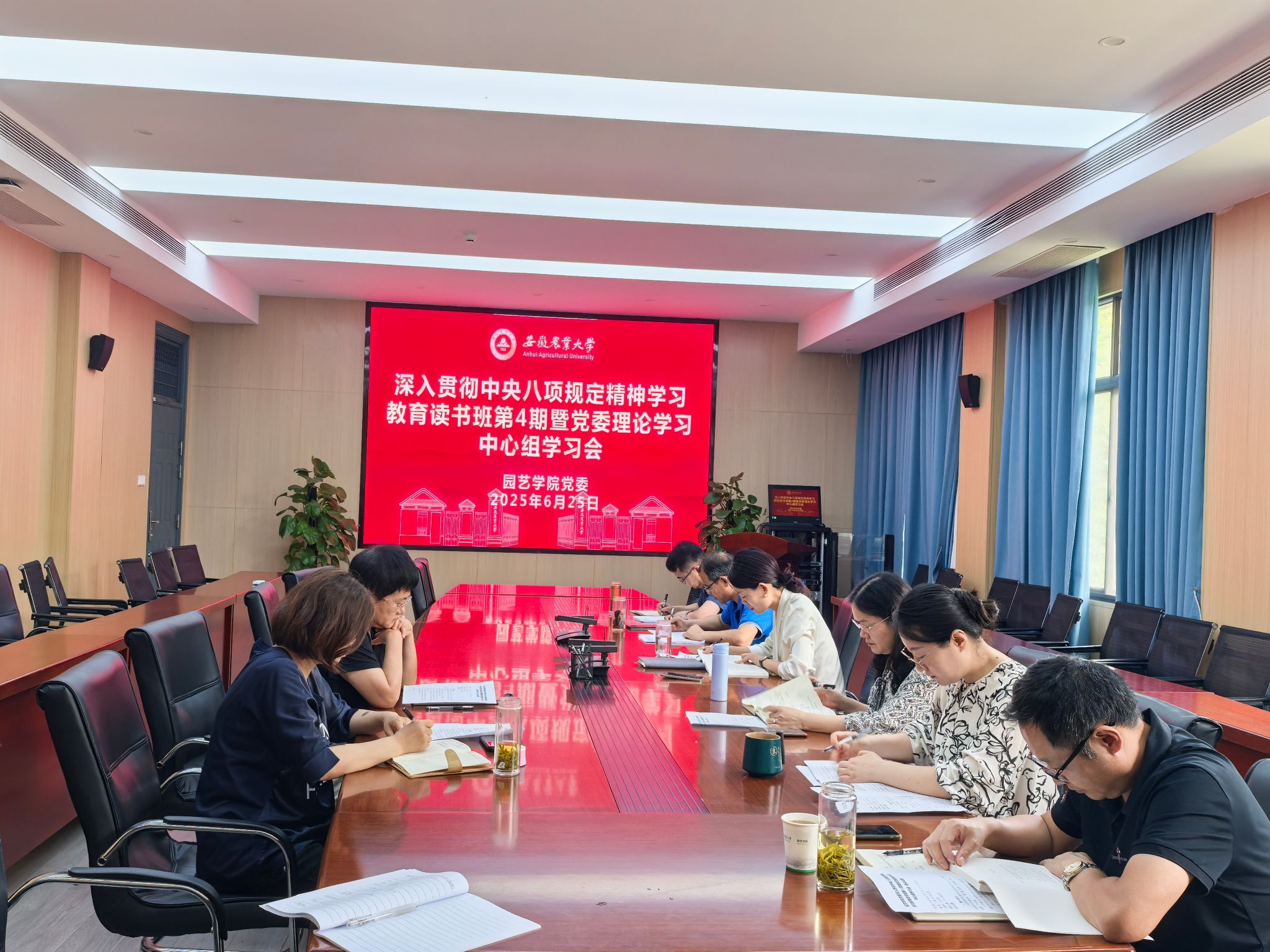 读书班坚持领导领学、集中学习、个人自学、交流研讨相结合,原原本本研读《习近平关于加强党的作风建设论述摘编》、《习近平总书记关于党的建设的重要思想概论》第十章、领学传达了中共中央办公厅 国务院办公厅《整治形式主义为基层减负若干规定》、6月16日省委整治形式主义为基层减负工作领导小组会议、省委减负办 省纪委办公厅 关于3起整治形式主义为基层减负典型问题的情况通报、《关于深入贯彻中央八项规定精神 进一步厉行节约坚持“过紧日子”的通知》校党发(【2025】24号)和《中共安徽农业大学委员会贯彻落实中央八项规定精神 深入推进作风建设实施细则》(校党字【2018】81号)文件等主要内容。采取重点发言和随机交流相结合的方式,围绕“深入学习领会习近平总书记重要论述 以作风建设新成效全面推进农工商融合发展的特色高水平大学建设”主题交流研讨,院党委书记赵冠艳、党委委员孙俊作了重点发言,其他委员作了随机发言。