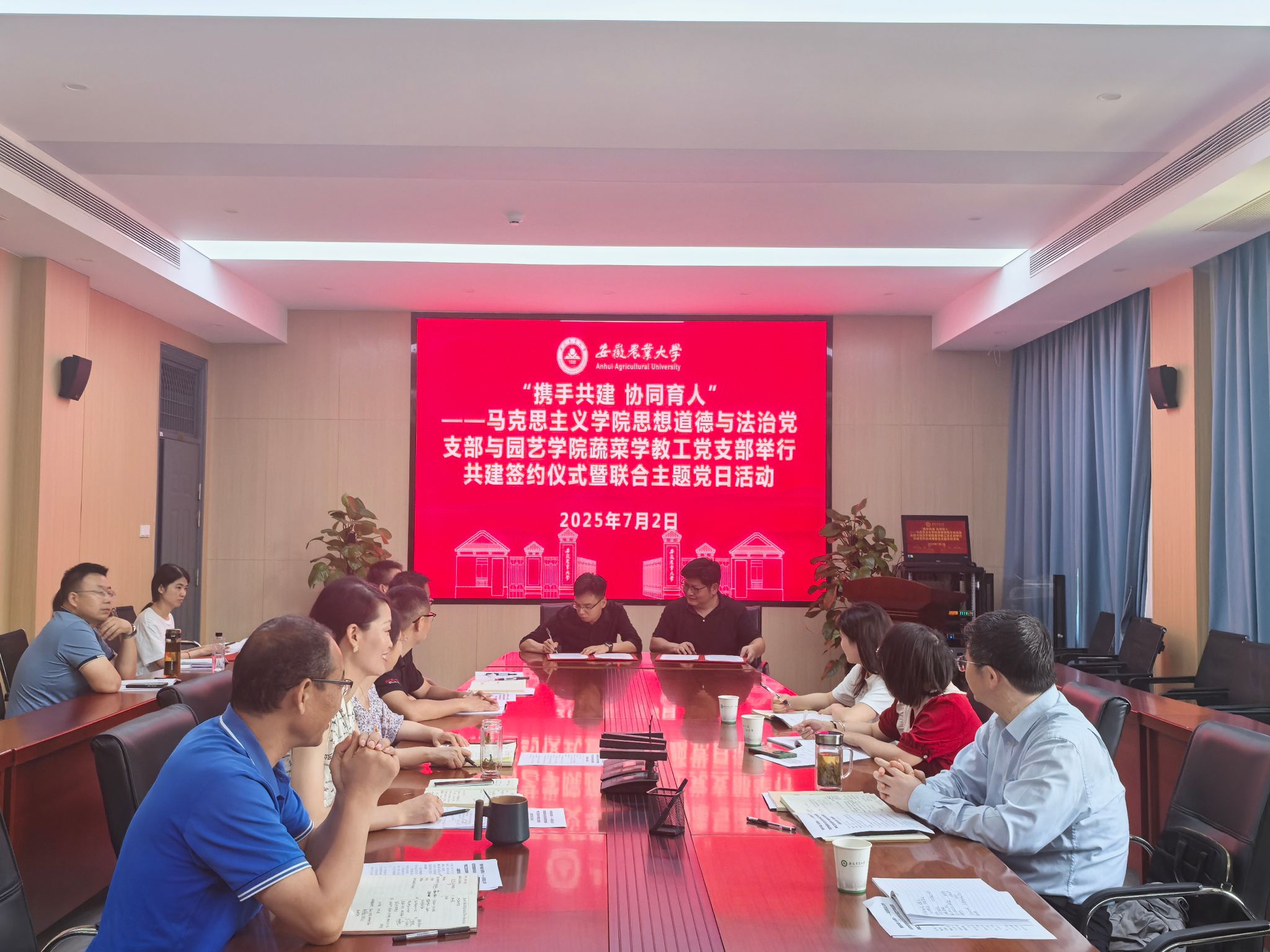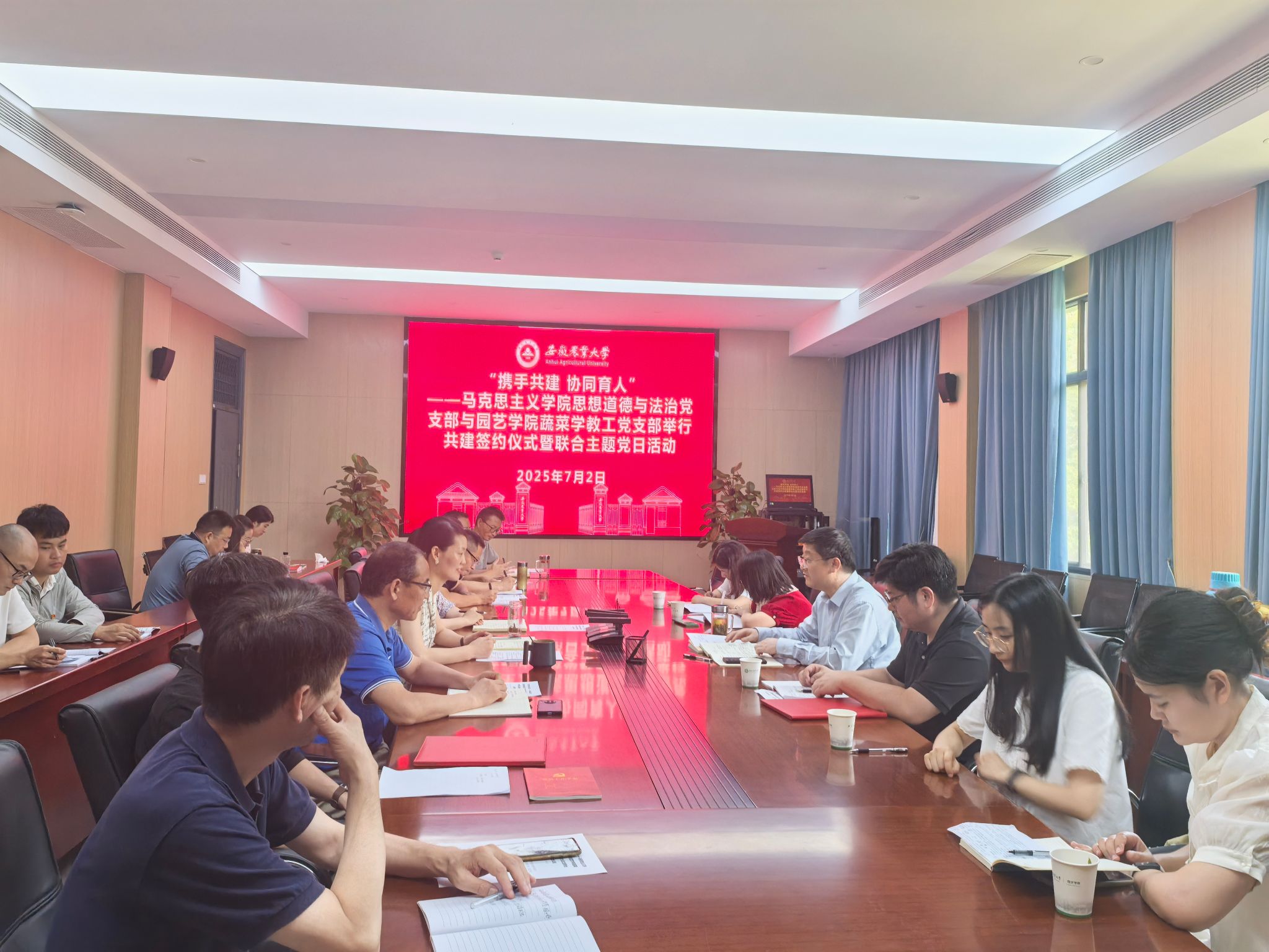 本网讯 为深入贯彻落实习近平总书记关于党的建设的重要思想和关于建设教育强国的重要讲话精神,坚持以高质量党建引领高质量发展,推动基层党组织共建共享、互学互鉴,7月2日上午,园艺学院蔬菜学教工党支部与马克思主义学院思想道德与法治党支部联合举办共建签约仪式暨联合主题党日活动。活动旨在通过支部共建,深化作风建设,强化专业思想教育,促进思政课程与课程思政协同发力,构建协同育人新格局。两院领导部分班子成员、支部委员及党员教师代表参加活动,活动由院党委书记赵冠艳主持。