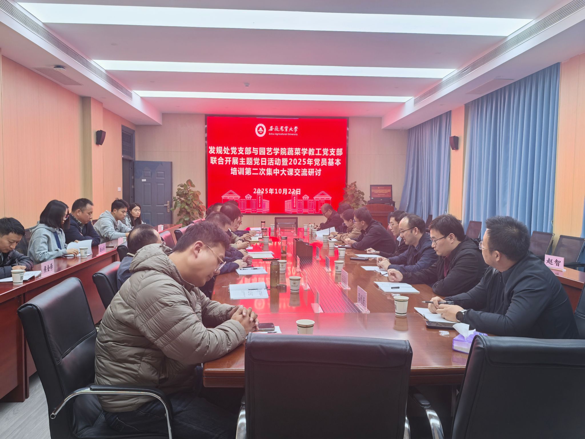 本网讯 为深入学习贯彻习近平总书记关于教育的重要论述,践行教育强国使命,落实立德树人根本任务,奋力开创“双一流”建设新局面,10月22日下午,园艺学院蔬菜学教工党支部与发规处党支部联合开展主题党日暨2025年党员基本培训第二次集中大课交流研讨,活动由园艺学院蔬菜学教工党支部书记王文杰主持。