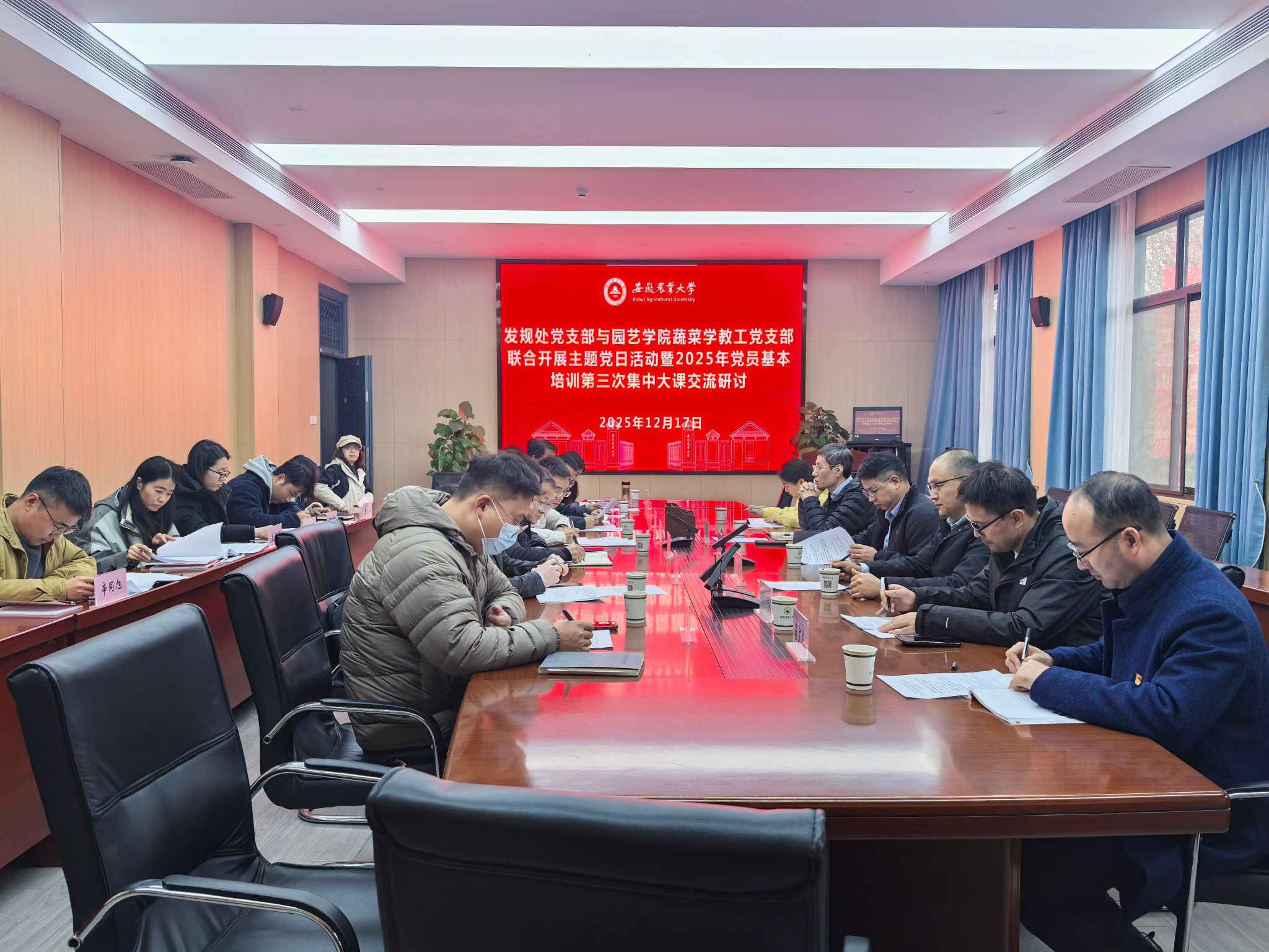 本网讯 12月17日下午,园艺学院蔬菜学教工党支部与发规处党支部联合开展主题党日活动,并围绕2025年党员基本培训第三次集中大课内容进行交流研讨。校党委常委、副校长吴祥为参加活动并作指导讲话。发规处党支部书记、处长王瑞,高等教育研究所所长赵智及两个党支部全体党员参加会议。会议由蔬菜学教工党支部书记王文杰主持。