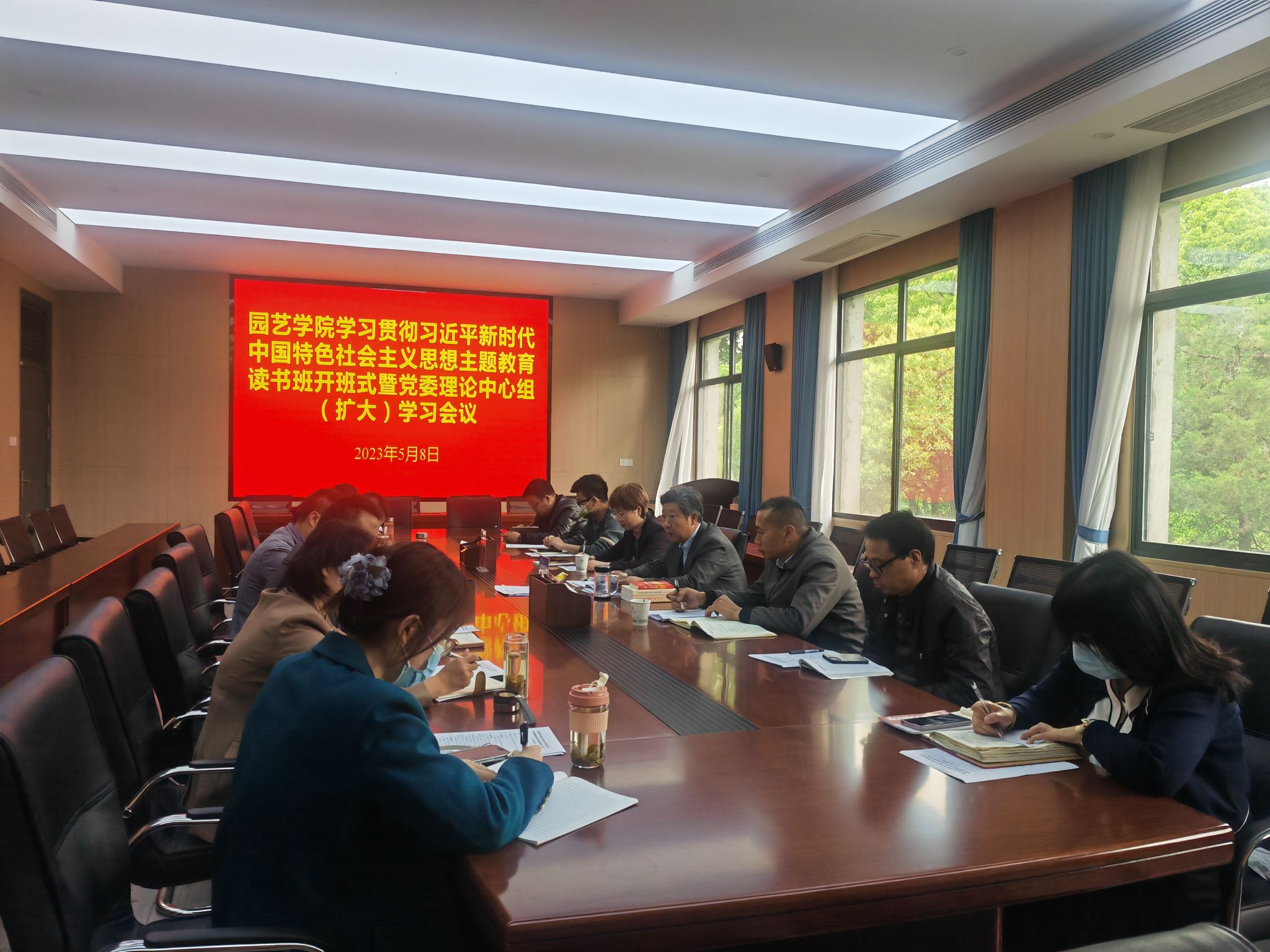 本网讯 5月8日,园艺学院在三楼会议室召开园艺学院学习贯彻习近平新时代中国特色社会主义思想主题教育读书班开班式暨党委理论中心组(扩大)学习会。学院领导、院党委委员、副科以上干部、系主任、全体党支部书记参加了会议,学校主题教育第四联络组副组长姚洪章、成员张村侠列席会议,会议由院党委书记朱绍友主持。
