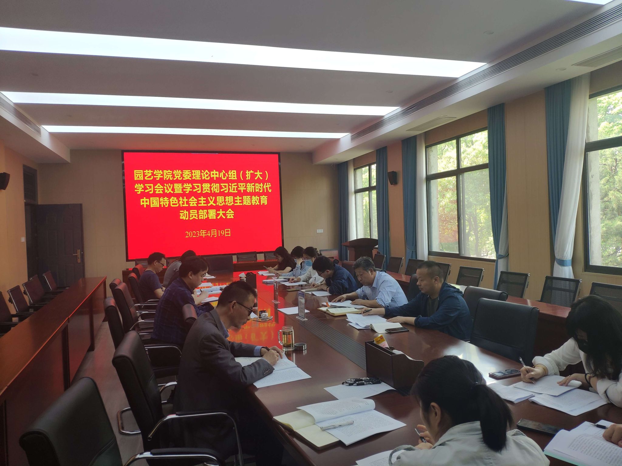 本网讯 4月19日,园艺学院在三楼会议室召开园艺学院召开党委理论中心组(扩大)学习会暨学习贯彻习近平新时代中国特色社会主义思想主题教育动员部署大会。学院领导、院党委委员、副科以上干部、系主任、全体党支部书记和支委、部分教师和学生代表等参加了学习,会议由院党委书记朱绍友主持。