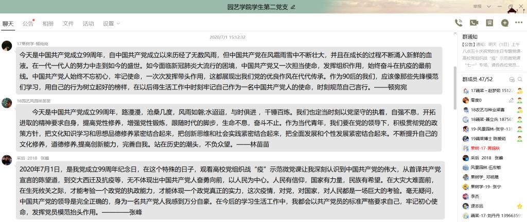畅谈学习感悟。学院青马班学员通过线上开展习近平总书记给复旦大学《共产党宣言》展示馆党员志愿服务队全体队员回信精神的学习,激励园艺学子坚定理想信念,奋发有为。学生第一党支部结合“七一”系列活动,组织支部党员学习“战役故事”,传递责任与担当的力量,向抗疫英雄们致敬!学生第二党支部结合战“疫”示范微党课学习,线上开展学习交流,进一步坚定理想信念。