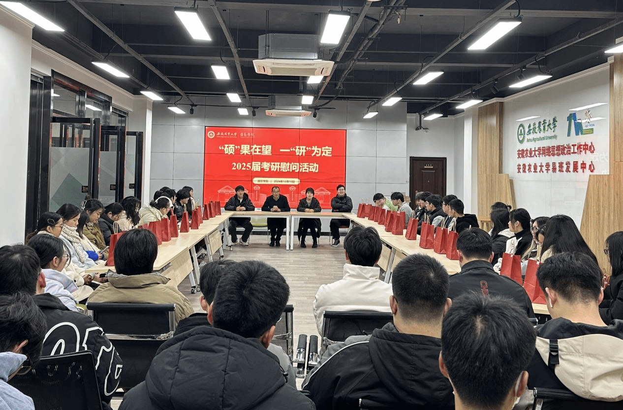 本网讯 2025年全国硕士研究生招生考试在即,为增强学生考试信心,缓解备考压力,12月10日,学院在大学生创客空间举办2025届考研慰问活动。学院毕业班辅导员、招生就业负责老师、在读研究生代表和全体备考学生参加慰问会,会议由党委副书记、纪委书记叶辉主持。