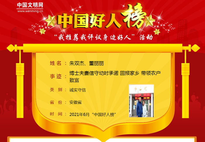 近日,中央文明办发布6月份中国好人榜。我校园艺学院教师董丽丽和丈夫朱双杰,荣获“诚实守信好人”。