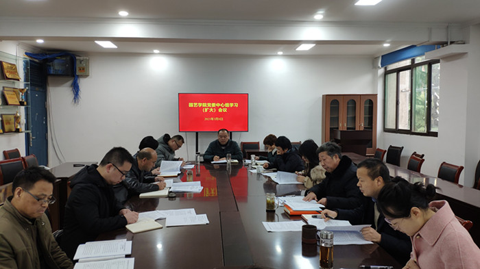 本网讯 3月8日上午,学院在二楼会议室召开院党委中心组(扩大)学习会。学院党政领导、党委委员、副科以上干部、支部书记、系主任等参加了学习,会议由院党委书记朱绍友主持。