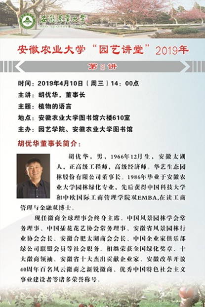 植物也会说话,你听过吗? 410日下午,“园艺讲堂”第6讲如期开讲,学院邀请1986届校友、华艺生态园林股份有限公司董事长胡优华来校授课副校长马传喜为胡优华颁发了“园艺讲堂特约专家”荣誉聘书,他充分肯定我院在本科课堂教学方面的改革和尝试,并与胡优华校友就加强校企合作和协同育人进行了深入交流。园艺学院院长方从兵和师生们共同参加了本次讲座。