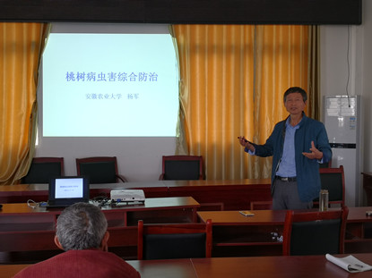 本次培训主要围绕桃、葡萄等果树优质高效的栽培技术为主题。培训会上,杨军结合前期的观察和调研,认真分析了山东陈村果树的栽培现状,并从优良品种选择、栽培模式和病虫害防治等三个方面对该村低效果园升级改造进行了详细的阐述