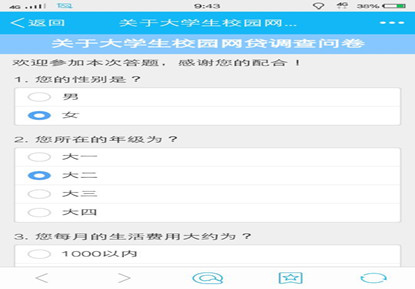 12月份以来,我院积极摸底排查,进行专题调研,积极深入学院各个年级,各个班级,学生干部走访各个寝室,动员大家积极填写网络调查问卷,开展形式多样的“校园网贷”情况调研工作。从班级中共抽取近200份问卷进行汇总统计,并及时召开座谈会,有的放矢地教育和引导学生树立正确的消费观念。