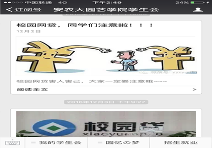 12月份以来,我院结合线下动员,利用线上自媒体平台,使用微信、QQ等手段开展“校园网贷是什么”、“怎样抵制校园网贷”等宣传活动,并定期发布真实案例,让同学们深刻了解校园网贷的危害,定期发布发布校园网贷防范指南,揭露“校园贷”的阴谋,时刻提醒同学们远离“失控”的“校园网贷”,增强风险意识。