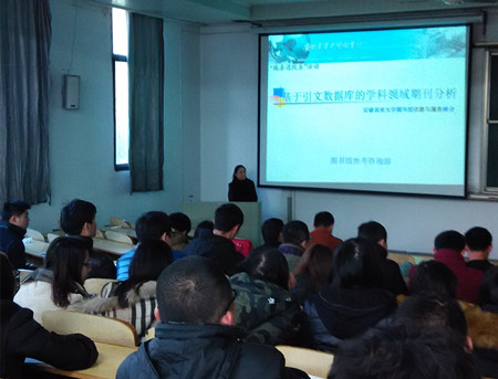 本网讯  127下午,图书馆参考咨询部林晖老师受邀到我院,在二240教室为学院师生作了一场题为《基于引文数据库的学科领域期刊分析》的报告。院党委书记张令峰、副院长方从兵、学院部分老师和研究生参加了报告会,报告会由方从兵主持。