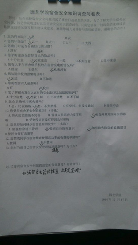 为进一步落实考风考纪与安全教育工作,12月19日上午,学院党委副书记葛红带领学院全体专兼职辅导员对学院学生宿舍进行了一次全面的排查,针对学生宿舍中存在的私自外宿、私拉电线、禁用物品和易燃杂物等安全隐患责令宿舍同学及时整改(特别是今年学生宿舍空调初次开通,严格要求学生控制空调温度,以适宜为先,杜绝空调温度过高或是长时间使用)。同时,学院采用张贴《园艺学院宿舍安全倡议书》、分发《园艺学院宿舍安全知识手册》、《园艺学院宿舍安全知识调查问卷表》问卷调查、《2014级全体学生冬季宿舍安全暨诚信考试主题班会》、辅导员巡考、诚信考试亮牌示范等多途径、多形式落实考风考纪与安全教育工作,拓宽学生参与考风考纪与校园安全主体教育渠道。