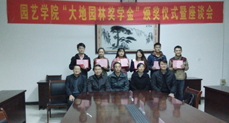 本网讯:11月26日下午,园艺学院第五届“大地园林奖学金”颁奖仪式在学院会议室隆重举行,安徽大地园林工程有限公司总经理凌利宏校友、学院党委书记张克永、学院党委副书记葛红、副院长裴孝伯出席了颁奖仪式。全体获奖学生和部分学生代表参加了颁奖仪式。仪式由学院党委副书记葛红主持。