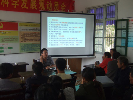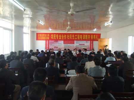 1024,园艺学院“农民专业合作社‘阳光工程’培训班”开班典礼在长丰县陶楼乡隆重举行。省农委、合肥市总工会、市农委、长丰县委、县政府、县农委、科技局、陶楼乡等有关单位负责人及当地100多名蔬菜合作社社员出席了开班典礼。园艺学院朱世东院长介绍了学院多年来广泛开展产学研合作,拓展“大别山道路”的基本情况以及本次培训的主要内容与计划安排。省阳光办程晓冬主任强调了“阳光工程”培训工作的重要性,并对培训工作提出了具体要求。长丰县政府胡成玉副县长指出本次培训对于培育现代新型农民,构建和谐新农村,具有重要意义。