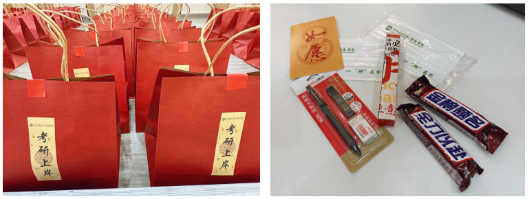 学院定制的礼包寄托着对考研学子满满的祝福:6款福运主题的盲盒笔,祝愿学子们执笔乘风,只待金榜题名时;一张张充满祝福的贺卡,传递着学院对考研学子最真诚的鼓励;“连中三元”文具三件套祝愿考生神笔助力,考神附体,“芯”“橡”事成;两块士力架寓意考研学子“士”气如虹,全“力”以赴,“架”海擎天。希望考研学子全力以赴,祝愿考研学子金榜题名;印有学院logo的口罩,代表了考研赛场上学院与你同在。一“研”为定,大家顶峰相见!