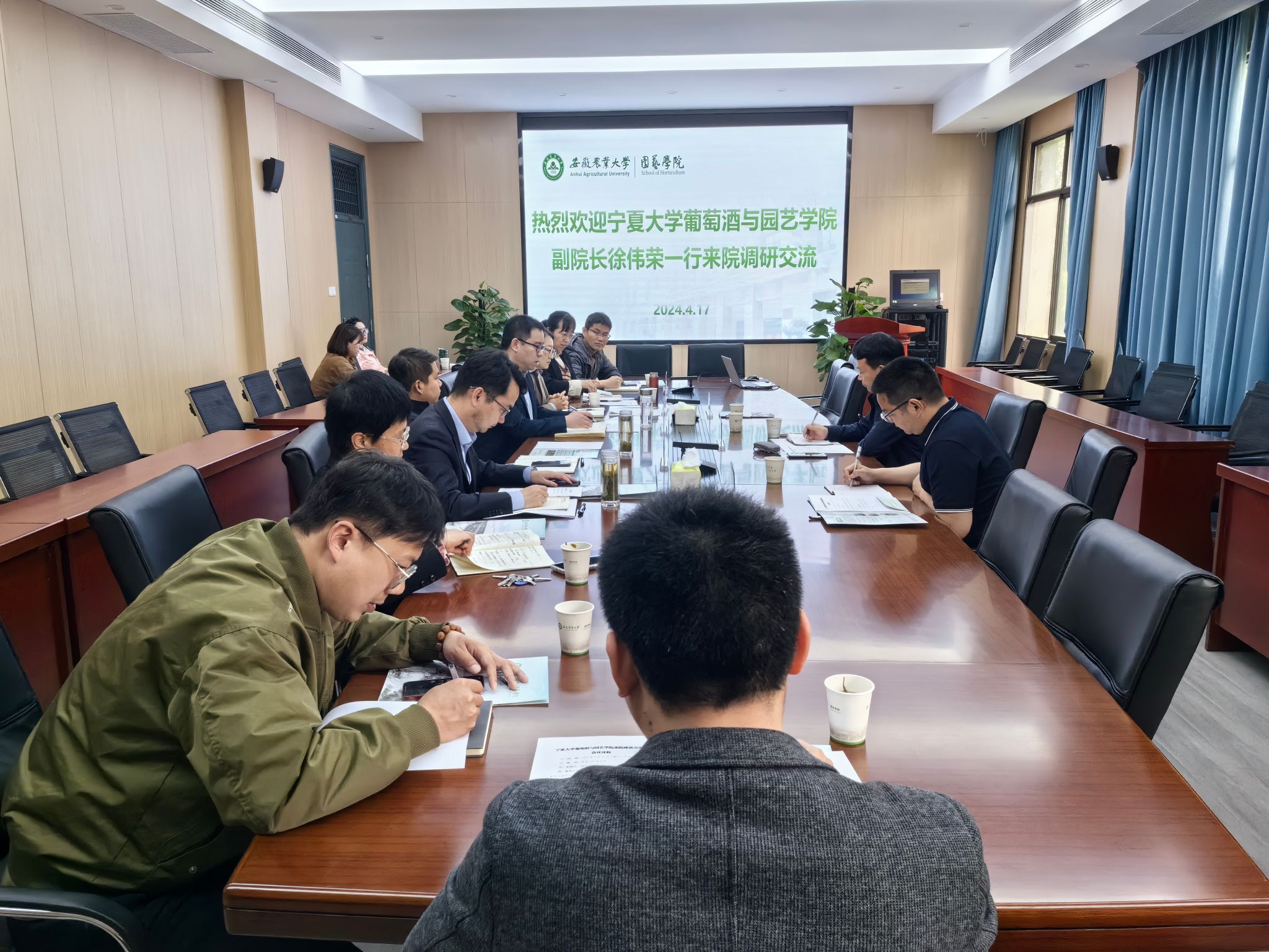 本网讯:4月17日下午,宁夏大学葡萄酒与园艺学院副院长徐伟荣一行来院调研交流。副院长殷学仁主持座谈交流会,学院党政班子,系部主任及部分教师和博士生代表参加会议。会前,赵冠艳热情接待了徐伟荣一行。