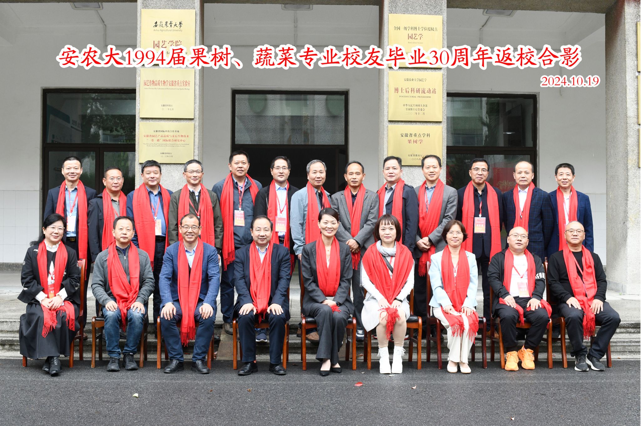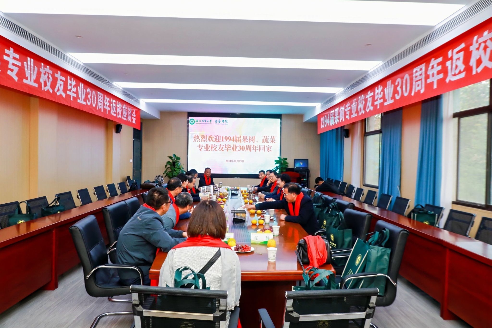本网讯 10月19日,我院1994届果树专业、蔬菜专业校友毕业30周年回母校团聚并参加学校建校96周年、在肥办学70周年纪念大会。学院隆重召开座谈会欢迎校友回家。学院党政领导班子,1994届果树、蔬菜专业返校校友,部分学生代表参加会议。