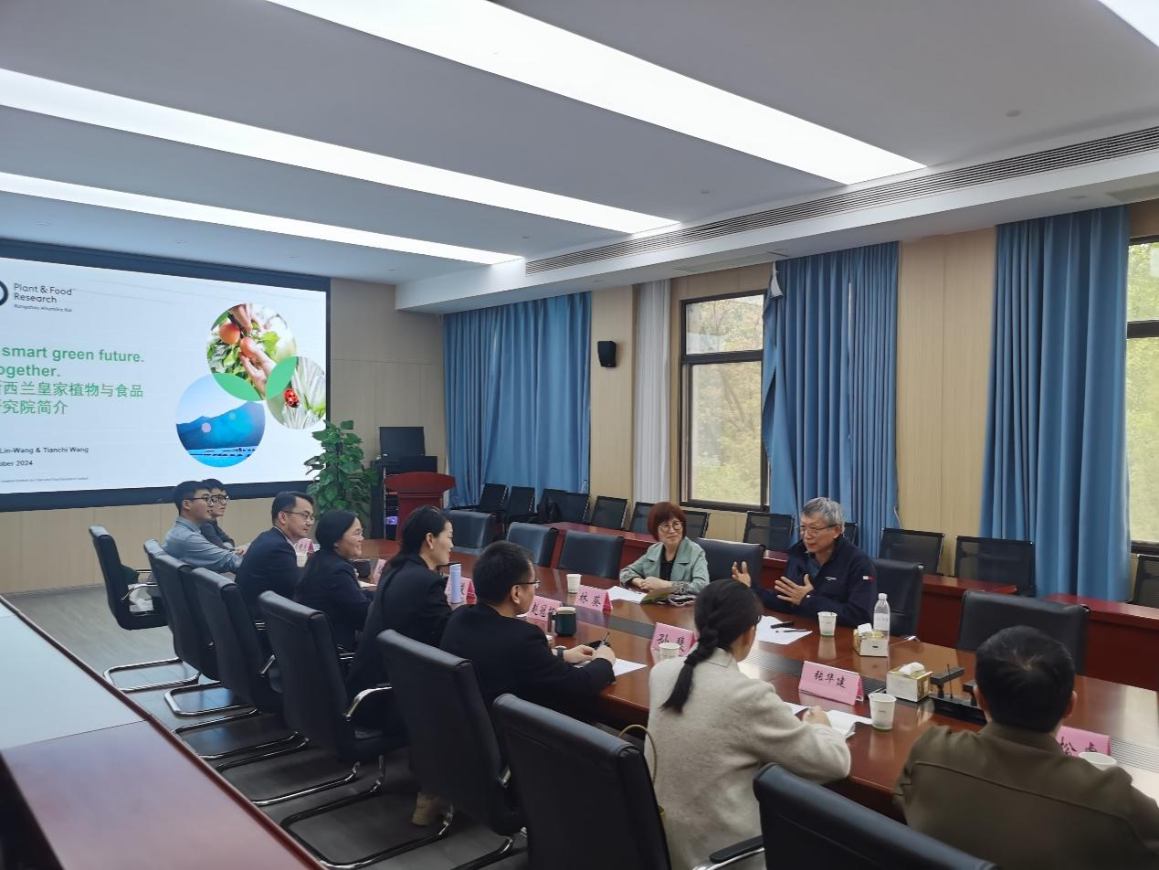 本网讯 为进一步深化与新西兰交流合作,10月27日-28日,新西兰皇家科学院植物与食品研究院(The New Zealand Institute for Plant and Food Research Limited,PFR)高级科学家Kui Lin-Wang和Tianchi Wang应邀来院指导交流,并做学术报告。校国际合作处处长孙裴、副处长张华建到会指导,园艺学院党政领导班子、系主任、平台负责人、海外背景教师代表参加会议。