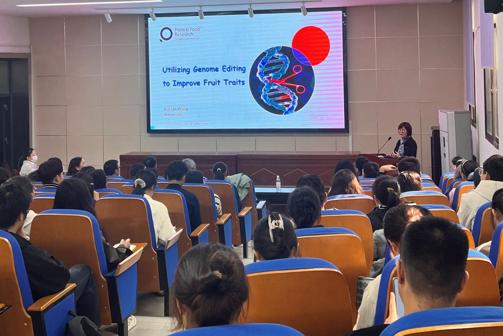 次日,Kui Lin-Wang和Tianchi Wang教授分别做了题为“Utilizing genome editing to improve fruit traits”和“Innovative approaches for fast breeding and improvement of Actinidia spp.”的学术报告,学院教师和研究生参加了报告会。(图文/杨广艳 编辑/何仁婷 初审/殷学仁 审核/赵冠艳)