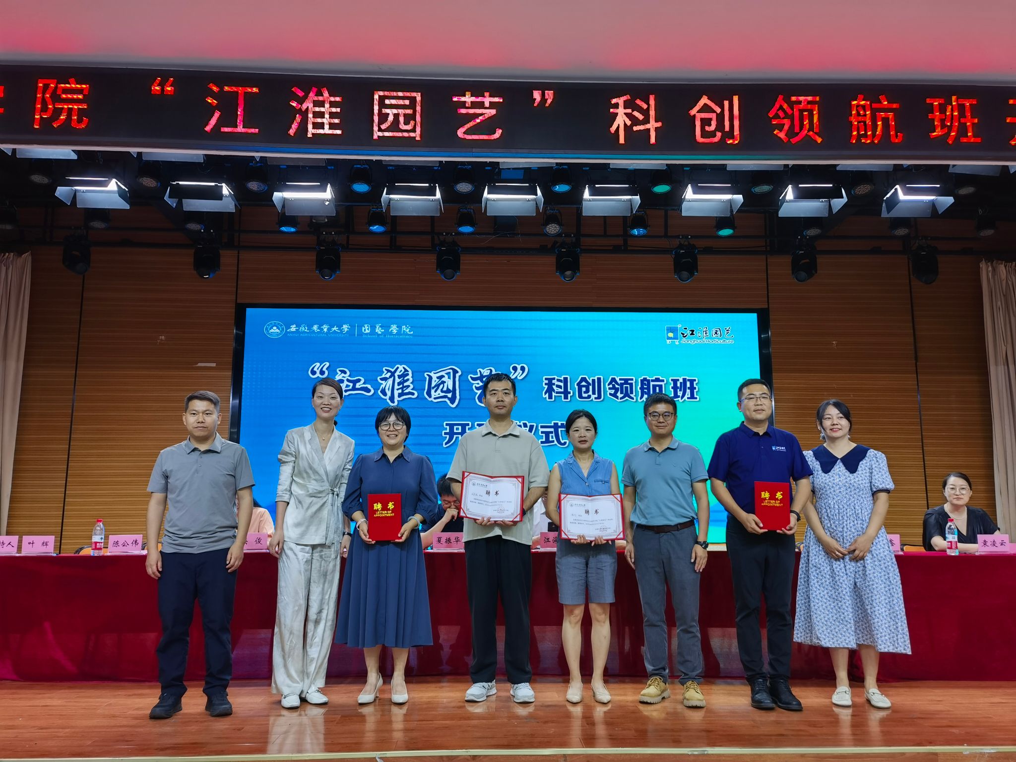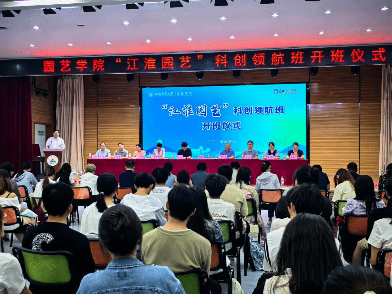 本网讯 5月30日下午,“江淮园艺”科创领航班开班仪式在欣苑四楼大学生活动中心顺利举办。校党委常委、副校长江海洋出席开班仪式并讲话,安徽江淮园艺种业股份有限公司董事长戴祖云,科创班企业导师李曼、周阜宣、谢钊、杨中周,校教务处、创新创业学院、学生处、团委等相关单位负责人,以及园艺学院班子全体成员和130余名学员参加仪式。