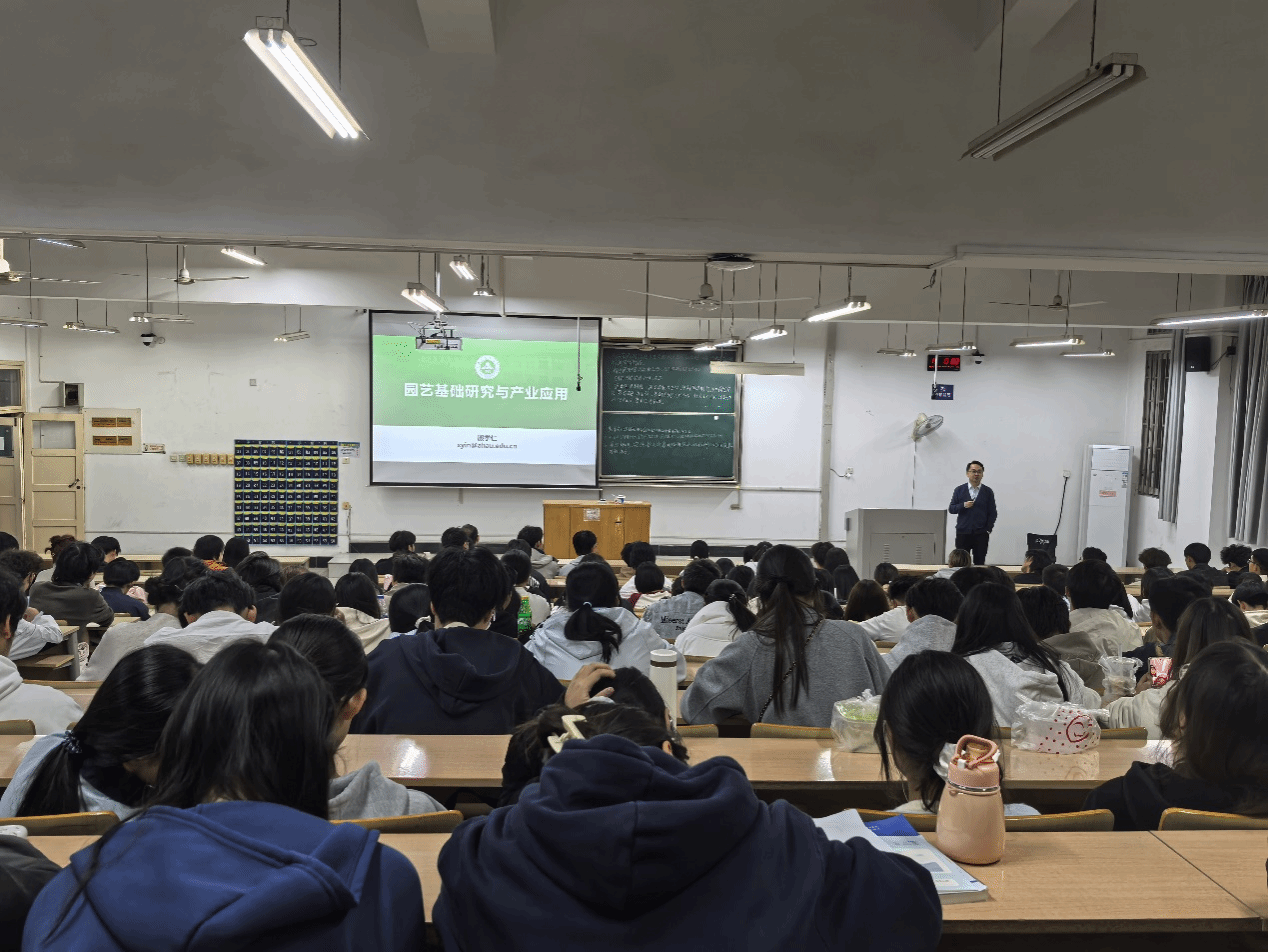 本网讯 园艺产业在国民经济中作用有多大?园艺学科发展前景如何?学园艺能干什么?……为进一步答疑解惑大一新生对园艺学科专业的认知和理解,增强新同学对专业的认同感,10月22日晚,国家优秀青年基金获得者殷学仁教授、国家梨产业体系岗位专家贾兵教授、安徽省学术与技术带头人汪承刚教授为新生带来了一场富有思想性、专业性、实践性的入学教育课。学院党委副书记(主持工作)程玉峰,党委副书记、纪委书记叶辉,本科生班主任、专职辅导员以及2025级全体本科生现场聆听。