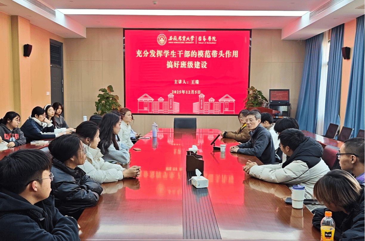 本网讯 为加强学生干部培训培养,充分发挥学生骨干在班级建设中的引领带动作用,12月5日下午,学院邀请校发规处处长王瑞围绕“如何充分发挥学生干部带头模范、抓好班级建设”为主题为学生干部讲授专题思政课并进行面对面交流,2025级本科生主要学生班干部参加。