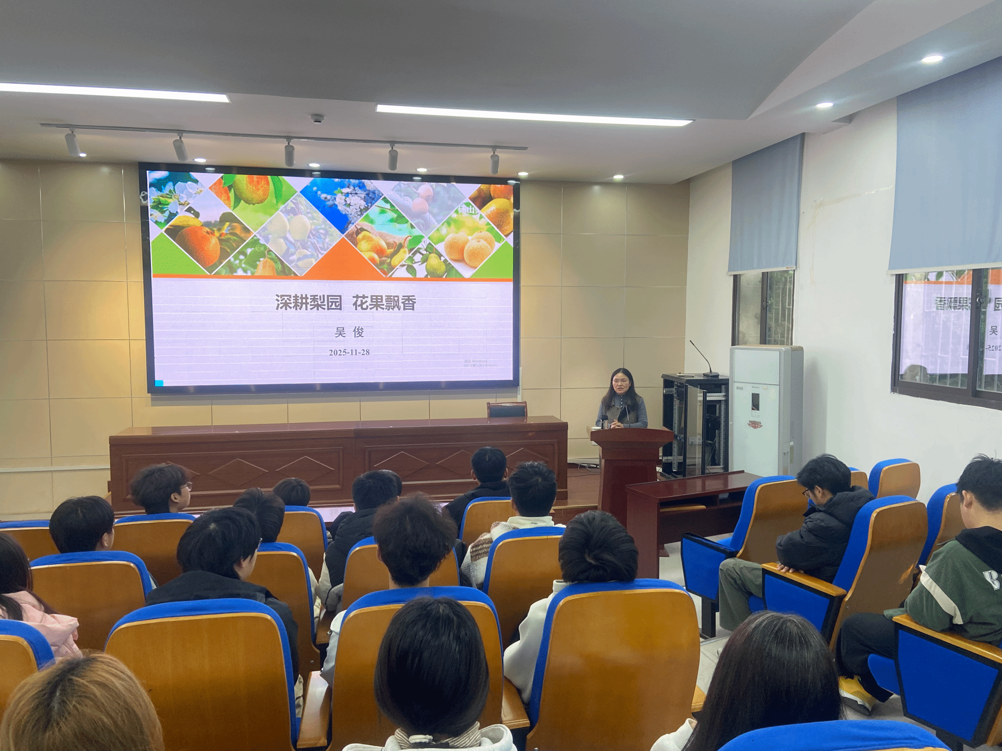 吴俊教授结合自身数十年求学与科研经历,生动讲述了与园艺结缘、深耕梨园的奋斗故事。谈及园艺产业的发展前景,吴俊指出,随着消费升级与技术革新,园艺产业正迎来高质量发展的黄金期,市场价值与发展潜力持续凸显。她勉励同学们,要珍惜校园学习时光,既要扎实掌握专业理论知识,也要注重培养团队协作能力与实践创新思维,做有理想、有知识、会思考的新时代园艺青年。