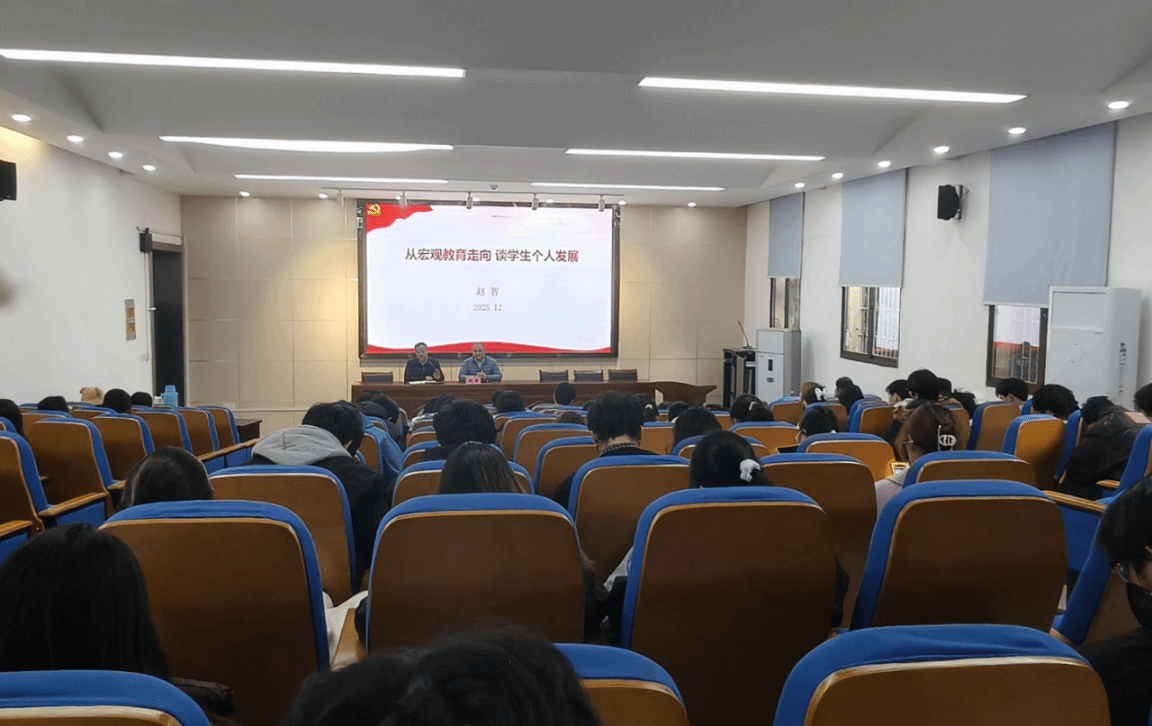 本网讯 为帮助学生把握教育发展趋势,明晰专业成长方向,12月19日下午,校高等教育研究所所长赵智以“从宏观教育走向,读学生个人发展”为主题,为2025级园艺专业1-5班学生讲授干货满满的思政课。