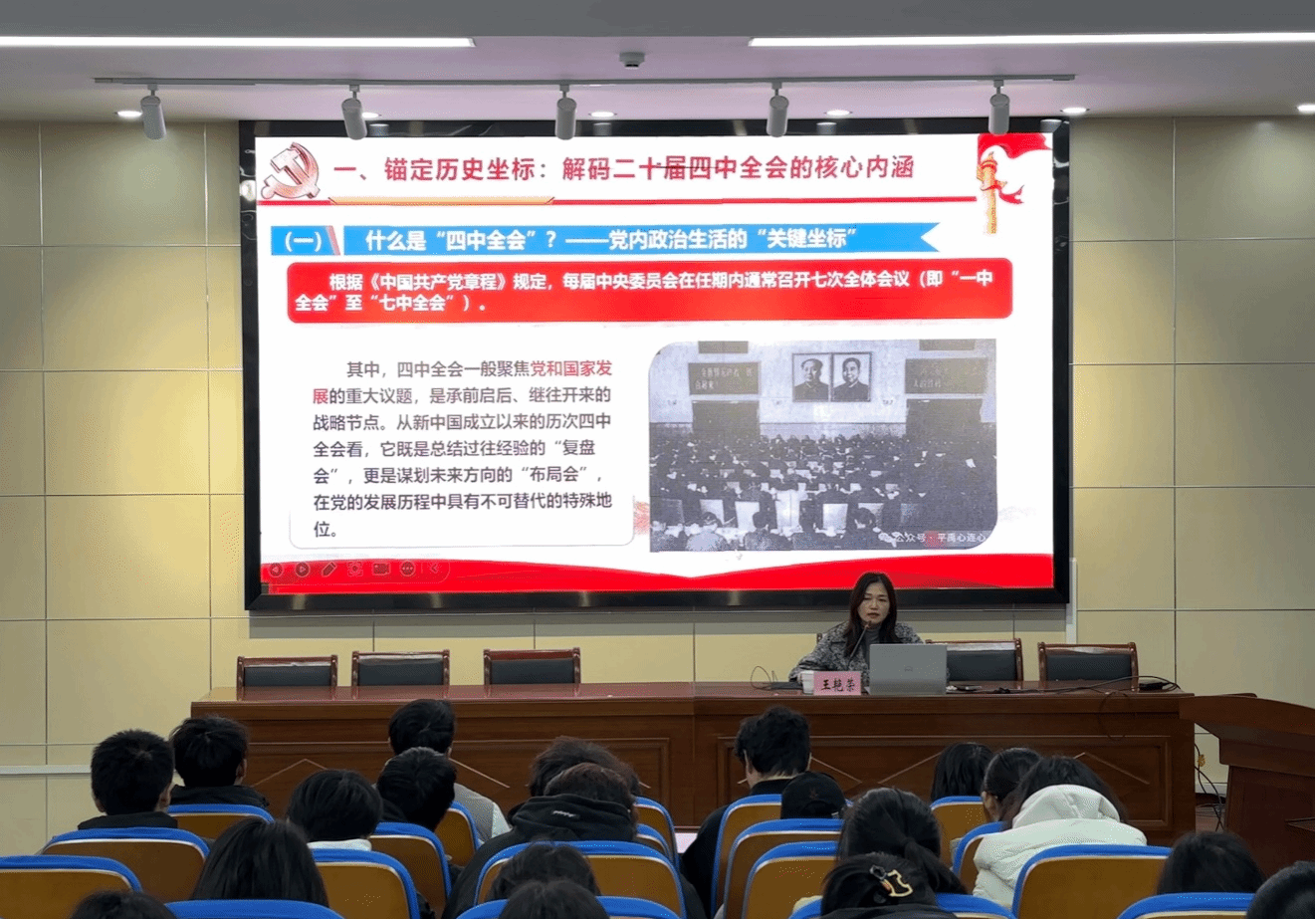 本网讯  为引导学子深刻领会党的创新理论成果,把握农业领域发展新机遇,12月22日下午,校人文社科处副处长王艳荣教授以“深学笃行党的二十届四中全会精神”为主题,为2025级园艺6-8班学生讲授思政课