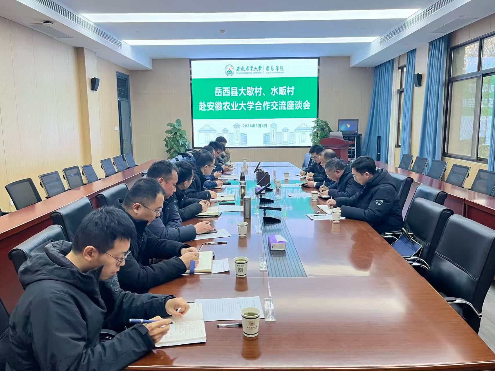 本网讯  1月4日下午,省政府办公厅驻岳西县水畈村第一书记顾正分、副队长罗文伯,大歇村书记汪品峰以及省政府办公厅驻大歇村工作队副队长徐炜锋一行来我院交流,围绕深化科技赋能、促进乡村经济发展进行座谈。座谈会由学院副书记(主持工作)程玉峰主持。社会合作处副处长陈雨、林学与园林学院副院长黄兴召、园艺学院副院长刘普等参加座谈。