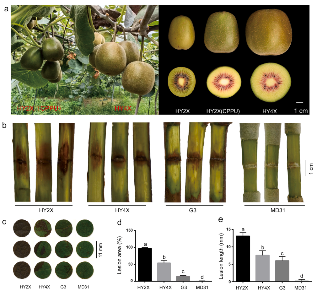 猕猴桃是深受消费者喜爱的水果,其中果肉呈红色的中华猕猴桃因其富含花青素等营养物质而备受青睐。然而,当前主栽的红肉猕猴桃品种多为二倍体,在果实大小和抗逆性方面有进一步提升的空间。多倍体育种是果树遗传改良的重要途径,多倍体植株常表现出器官巨大性、抗逆性增强等优势。研究团队前期通过秋水仙素诱导,成功获得了成熟的四倍体‘红阳’猕猴桃果实。研究发现,四倍体植株与二倍体在物候期上基本一致,但果实性状发生显著变化:四倍体果实平均单果重约为二倍体的2.2倍,果形更趋近于圆球形,同时保留了二倍体优良的风味和营养品质,并对溃疡病的抗性显著增强。研究筛选出如YABBY、SUN、果胶甲酯酶(PME)、伸展蛋白等可能与果实大小和形状调控相关的候选基因。