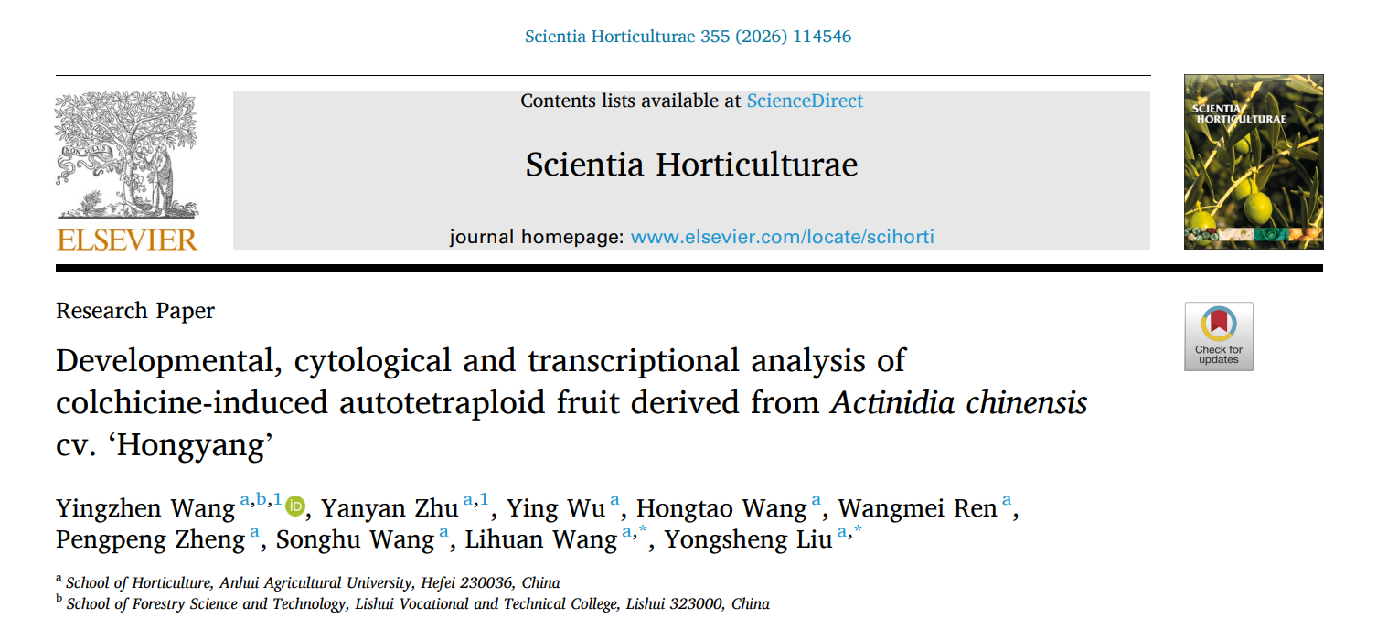 2026年1月1日,安徽农业大学园艺学院刘永胜团队在国际园艺学期刊《Scientia Horticulturae》上在线发表了题为“Developmental, cytological and transcriptional analysis of colchicine-induced autotetraploid fruit derived from Actinidia chinensis cv. ‘Hongyang’”的研究论文,该研究首次系统报道了四倍体‘红阳’猕猴桃的果实特性,并在细胞和转录水平揭示了其果实增大的潜在机制,为红肉猕猴桃的遗传改良提供了珍贵的种质资源和理论依据。