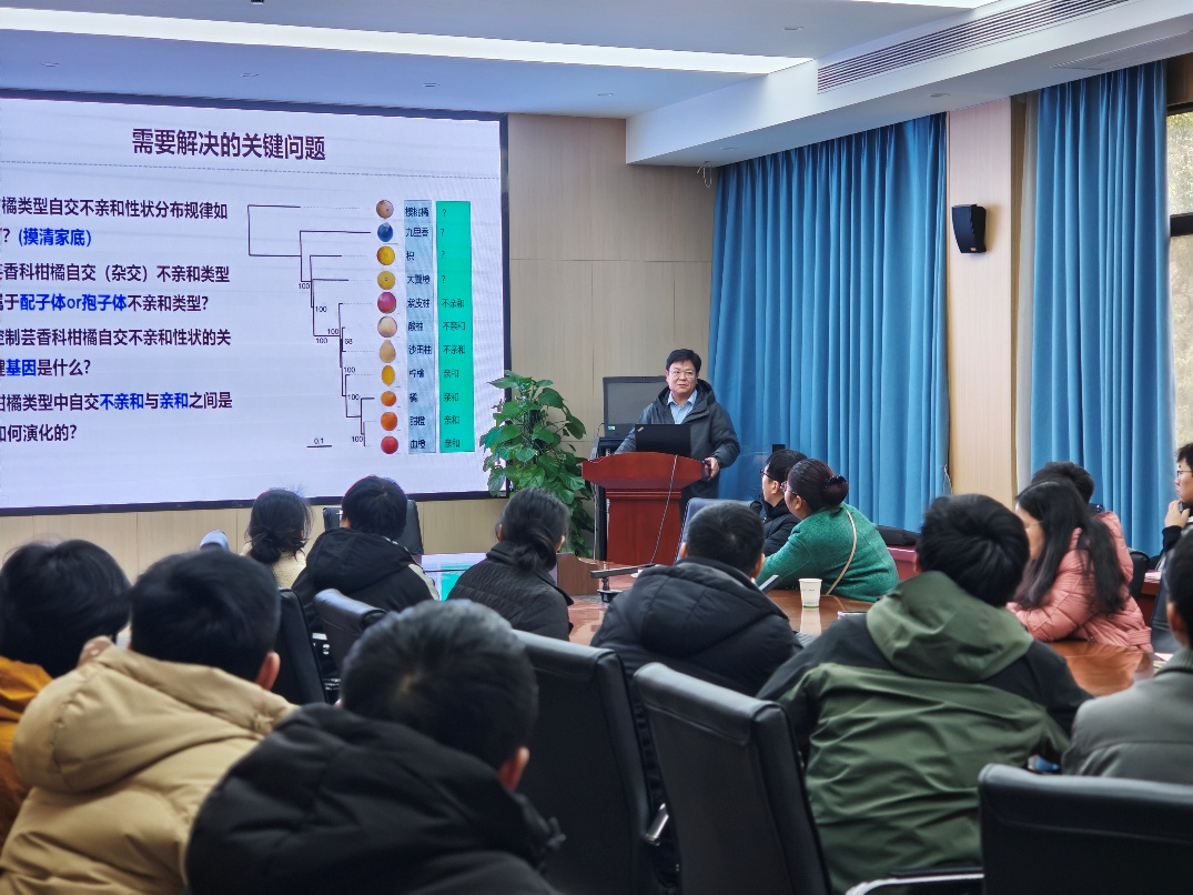 柴利军教授以《柑橘自交不亲和性基因:鉴定、演化与应用》为题,系统介绍了芸香科柑橘自交不亲和的分子机制与演化规律。他结合自身确定研究方向、开启课题的亲身经历,鼓励青年教师和研究生勇于探索科研“无人区”,弘扬原始创新精神。报告结束后,与会师生同柴利军教授展开深入交流,并就如何进一步推动学术资源共享提出了建设性意见。