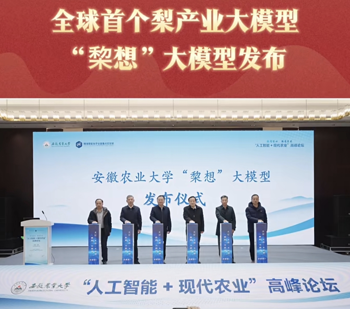 本网讯 2月10日,园艺学院联合人工智能学院发布全球首个梨产业垂直领域大模型——“棃想(PearThink)”。中国工程院院士赵春江,安徽省科学技术厅二级巡视员王孟忠,安徽省工业和信息化厅二级巡视员王国武,安徽省发展和改革委员会总工程师王焱,安徽省教育厅科研处一级调研员杨修顺、安徽省农业农村厅科学技术处一级调研员娄安军,合肥市发展和改革委员会、科学技术局、农业农村局等单位负责同志,中国科学技术大学党委常委、副校长傅尧,校领导张庆亮、操海群、董雨、吴祥为、陈黎卿、江海洋、董大明出席发布活动。