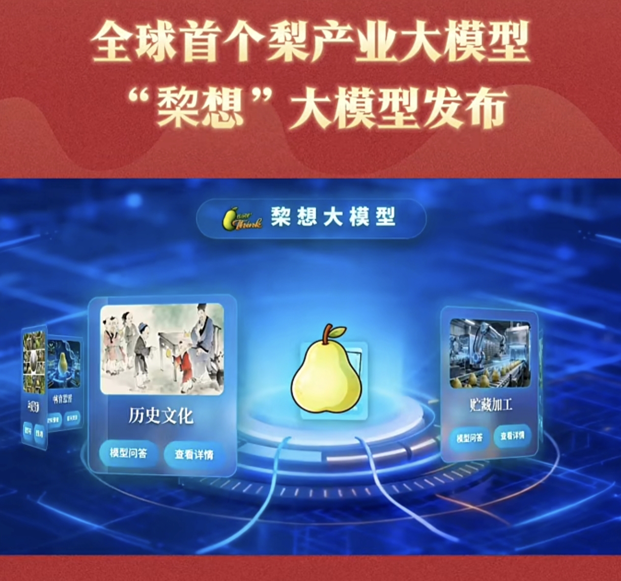 梨起源于中国。“棃”同“梨”,是古代梨的传统用字,以该字命名旨在追溯梨的历史渊源与文化底蕴;“想”有思索之意,不仅是对梨文化传承的深度思考,也是对梨科技创新的深层次思考。“棃想”谐音“理想”,寄喻对梨产业未来的美好憧憬。“棃想”大模型涵盖历史文化、种质资源、智慧育种、基因图谱、文献分析、高效栽培、病虫防控、贮藏加工等八大功能模块,深度整合梨产业相关万余篇文献、千万级文字数据、数万组问答、上万张图像、数十万条表型数据以及百TB级基因组数据。大模型的核心目标是解决梨育种周期长、效率低的瓶颈问题,驱动产业从“果园”到“果盘”的全链条智能化,为梨产业优质、高效、绿色、智慧发展提供创新解决方案。