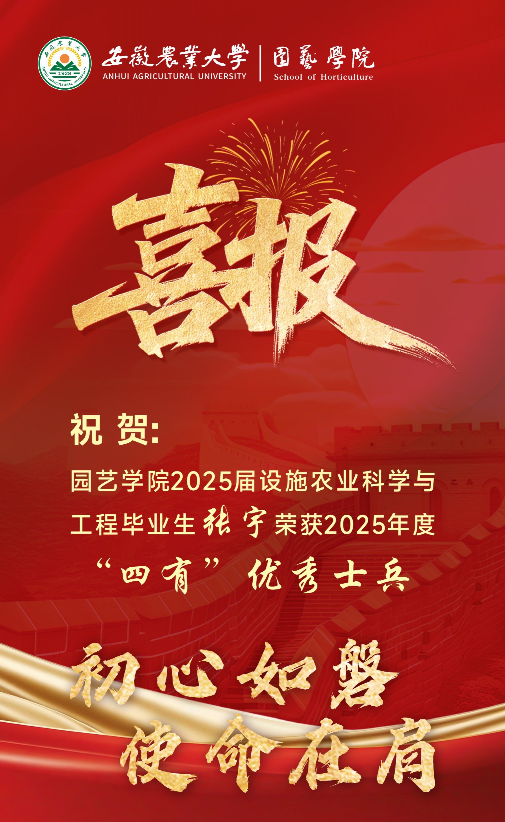 喜报!祝贺园艺学院2025届设施农业科学与工程专业毕业生张宇荣获中国人民解放军某部队“四有”优秀士兵荣誉称号