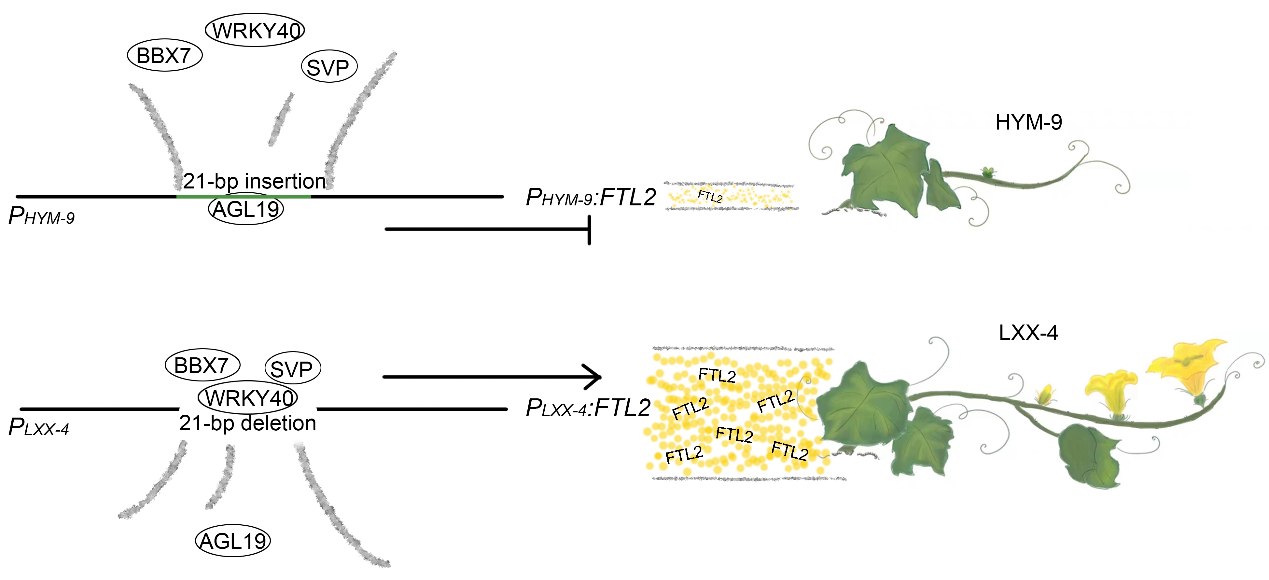 课题组通过田间性状筛查,发现了一个早熟的南瓜种质资源(LXX-4),利用早花材料LXX-4和晚花种质资源(HYM-9)构建了F2分离群体。利用Bulk Segregant Analysis(BSA)定位到性状决定候选基因FLOWERING LOCUS T-LIKE 2(FTL2),通过基因沉默等手段确定了该基因表达水平的显著差异是LXX-4和HYM-9开花时间性状差异的分子原因。进一步分析表明,在FTL2启动子中存在一个21bp的 InDel,其为转录水平上升和下降的关键原因。21bp的缺失使得抑制因子AGL19无法结合,并将激活因子BBX7、WRKY40和SVP募集到LXX-4的FTL2启动子上。反之,21bp的插入则招募抑制因子AGL19,并排斥了激活因子BBX7、WRKY40和SVP的结合。综上,该研究解析了中国南瓜开花调控网络中一个新的分子机制,为早熟南瓜的育种设计工作提供了一组新的分子模块。