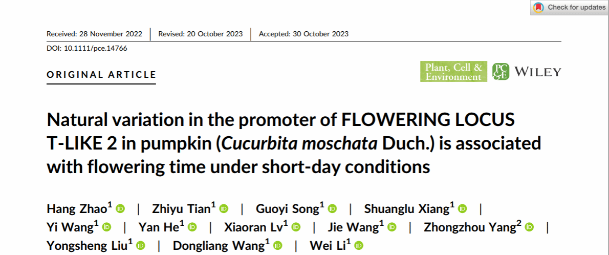 近日,园艺学院李委课题组在植物学经典期刊《Plant Cell & Environment》上发表了题为“Natural variation in the promoter of FLOWERING LOCUS T-LIKE 2 in pumpkin (Cucurbita moschata Duch.) is associated with flowering time under short-day conditions”的研究论文,揭示了启动子自然变异位点通过影响FLOWERING LOCUS T-LIKE 2基因转录水平从而调控短日照下中国南瓜开花时间的分子机制,该研究结果为简化早熟南瓜的育种工作提供了一个十分有用的顺式作用元件。